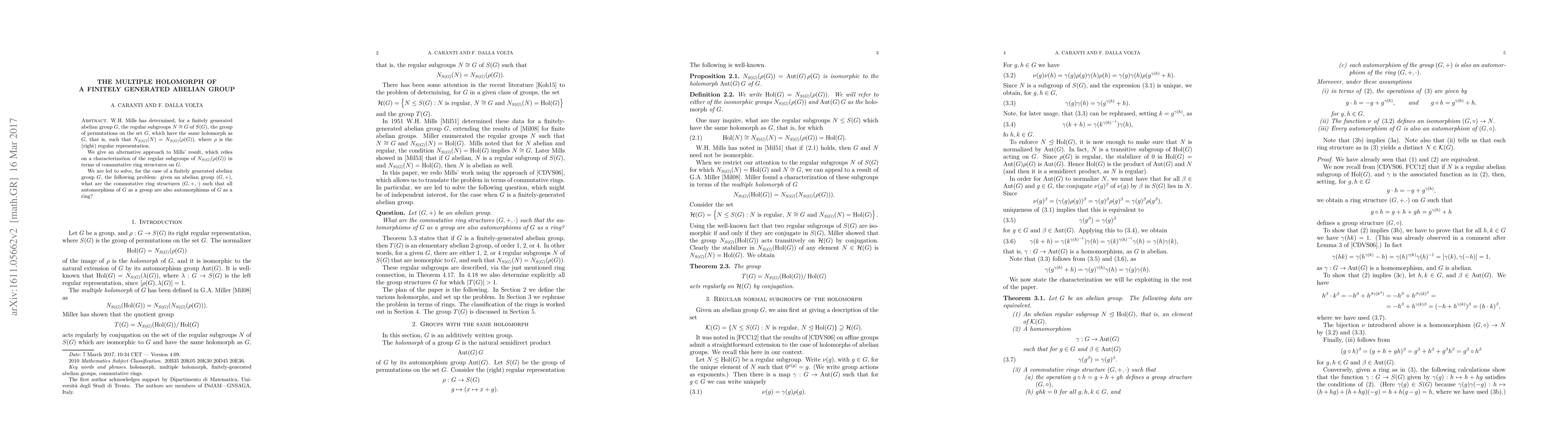 W.H.~Mills has determined, for a finitely generated abelian group $G$, the regular subgroups $N \cong G$ of $S(G)$, the group of permutations on the set $G$, which have the same holomorph of $G$, that is, such that $N_{S(G)}(N) = N_{S(G)}(\rho(G))$, where $\rho$ is the (right) regular representation. We give an alternative approach to Mills' result, which relies on a characterization of the regular subgroups of $N_{S(G)}(\rho(G))$ in terms of commutative ring structures on $G$. We are led to solve, for the case of a finitely generated abelian group $G$, the following problem: given an abelian group $(G, +)$, what are the commutative ring structures $(G, +, \cdot)$ such that all automorphism of $G$ as a group are also automorphisms of $G$ as a ring?