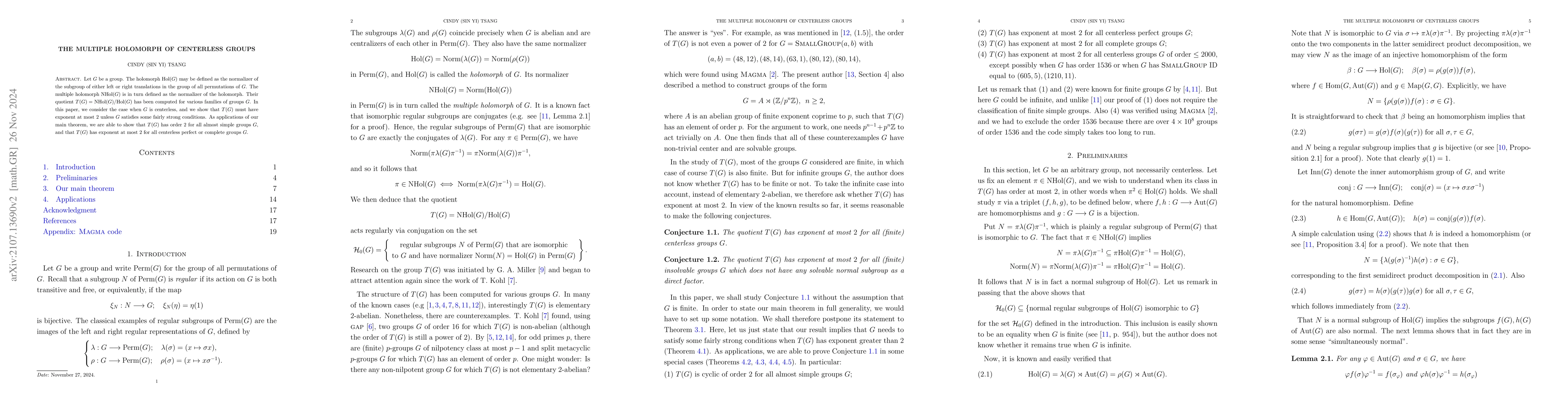 This paper investigates the multiple holomorph $\mathrm{NHol}(G)$ of centerless groups $G$, showing that the quotient $T(G) = \mathrm{NHol}(G)/\mathrm{Hol}(G)$ is elementary $2$-abelian unless $G$ meets specific strong conditions. It also proves that $T(G)$ has order $2$ for almost simple groups and is elementary $2$-abelian for centerless perfect or complete groups.