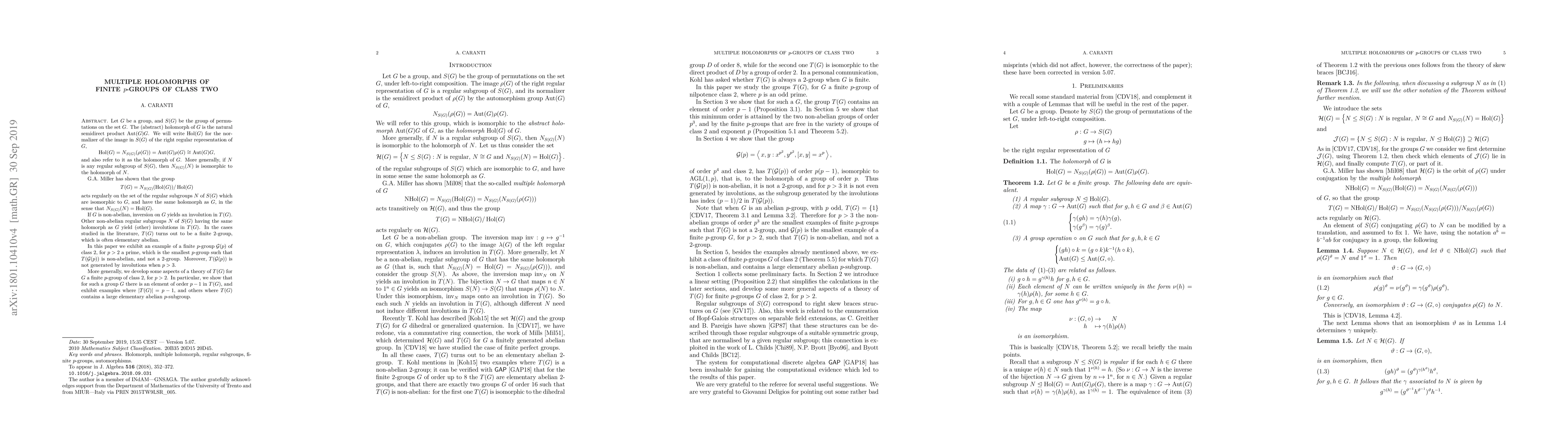 $\DeclareMathOperator{\Hol}{Hol}$$\DeclareMathOperator{\Aut}{Aut}$$\newcommand{\Gp}[0]{\mathcal{G}(p)}$$\newcommand{\Size}[1]{\left\lvert #1 \right\rvert}$Let $G$ be a group, and $S(G)$ be the group of permutations on the set $G$. The (abstract) holomorph of $G$ is the natural semidirect product $\Aut(G) G$. We will write $\Hol(G)$ for the normalizer of the image in $S(G)$ of the right regular representation of $G$, \begin{equation*} \Hol(G) = N_{S (G)}(\rho(G)) = \Aut(G) \rho(G) \cong \Aut(G) G, \end{equation*} and also refer to it as the holomorph of $G$. More generally, if $N$ is any regular subgroup of $S(G)$, then $N_{S(G)}(N)$ is isomorphic to the holomorph of $N$. G.A.~Miller has shown that the group \begin{equation*} T(G) = N_{S(G)}(\Hol(G))/\Hol(G) \end{equation*} acts regularly on the set of the regular subgroups $N$ of $S(G)$ which are isomorphic to $G$, and have the same holomorph as $G$, in the sense that $N_{S(G)}(N) = \Hol(G)$. If $G$ is non-abelian, inversion on $G$ yields an involution in $T(G)$. Other non-abelian regular subgroups $N$ of $S(G)$ having the same holomorph as $G$ yield (other) involutions in $T(G)$. In the cases studied in the literature, $T(G)$ turns out to be a finite $2$-group, which is often elementary abelian. In this paper we exhibit an example of a finite $p$-group $\Gp$ of class $2$, for $p > 2$ a prime, which is the smallest $p$-group such that $T(\Gp)$ is non-abelian, and not a $2$-group. Moreover, $T(\Gp)$ is not generated by involutions when $p > 3$. More generally, we develop some aspects of a theory of $T(G)$ for $G$ a finite $p$-group of class $2$, for $p > 2$. In particular, we show that for such a group $G$ there is an element of order $p-1$ in $T(G)$, and exhibit examples where $\Size{T(G)} = p - 1$, and others where $T(G)$ contains a large elementary abelian $p$-subgroup.