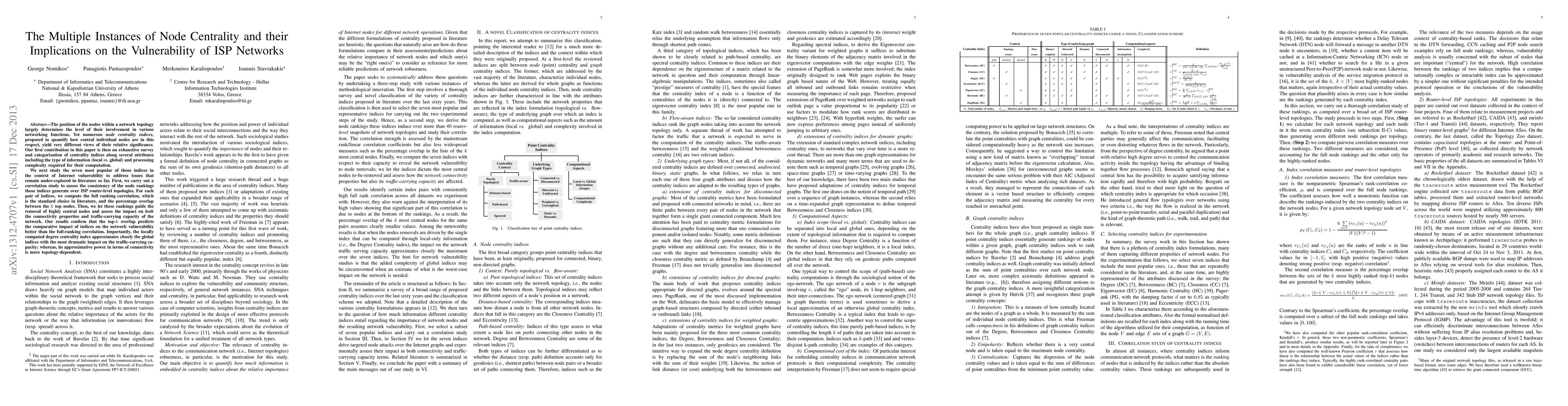 The position of the nodes within a network topology largely determines the level of their involvement in various networking functions. Yet numerous node centrality indices, proposed to quantify how central individual nodes are in this respect, yield very different views of their relative significance. Our first contribution in this paper is then an exhaustive survey and categorization of centrality indices along several attributes including the type of information (local vs. global) and processing complexity required for their computation. We next study the seven most popular of those indices in the context of Internet vulnerability to address issues that remain under-explored in literature so far. First, we carry out a correlation study to assess the consistency of the node rankings those indices generate over ISP router-level topologies. For each pair of indices, we compute the full ranking correlation, which is the standard choice in literature, and the percentage overlap between the k top nodes. Then, we let these rankings guide the removal of highly central nodes and assess the impact on both the connectivity properties and traffic-carrying capacity of the network. Our results confirm that the top-k overlap predicts the comparative impact of indices on the network vulnerability better than the full-ranking correlation. Importantly, the locally computed degree centrality index approximates closely the global indices with the most dramatic impact on the traffic-carrying capacity; whereas, its approximative power in terms of connectivity is more topology-dependent.