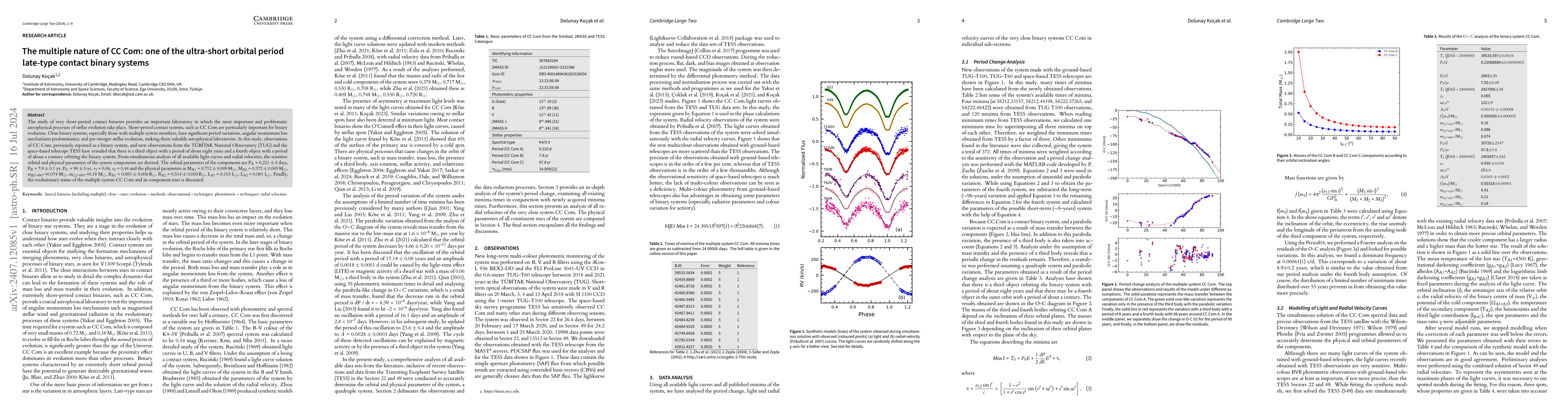 The study of very short-period contact binaries provides an important laboratory in which the most important and problematic astrophysical processes of stellar evolution take place. Short-period contact systems, such as CC Com are particularly important for binary evolution. Close binary systems, especially those with multiple system members, have significant period variations, angular momentum loss mechanisms predominance, and pre-merger stellar evolution, making them valuable astrophysical laboratories. In this study, observations of CC Com, previously reported as a binary system, and new observations from the T\"UB\.ITAK National Observatory (TUG) and the space-based telescope TESS have revealed that there is a third object with a period of about eight years and a fourth object with a period of about a century orbiting the binary system. From simultaneous analysis of all available light curves and radial velocities, the sensitive orbital and physical parameters of the system components are derived. The orbital parameters of the components are P$_{\rm A}=0.221\pm0$ days, P$_{\rm B}=7.9\pm0.1$ yr, P$_{\rm C}=98\pm5$ yr, $e_3$ = 0.06, $e_4$ = 0.44 and the physical parameters as M$_{\rm A1}=0.712\pm0.009$ M$_{\odot}$, M$_{\rm A2}=0.372\pm0.005$ M$_{\odot}$, $m_{B;i'=90^\circ}$=0.074 M$_{\odot}$, $m_{C;i'=90^\circ}$=0.18 M$_{\odot}$, R$_{\rm A1}=0.693\pm0.006$ R$_{\odot}$, R$_{\rm A2}=0.514\pm0.005$ R$_{\odot}$, L$_{\rm A1}$ = 0.103 L$_\odot$, L$_{\rm A2}$ = 0.081 L$_\odot$. Finally, the evolutionary status of the multiple system CC Com and its component stars is discussed.