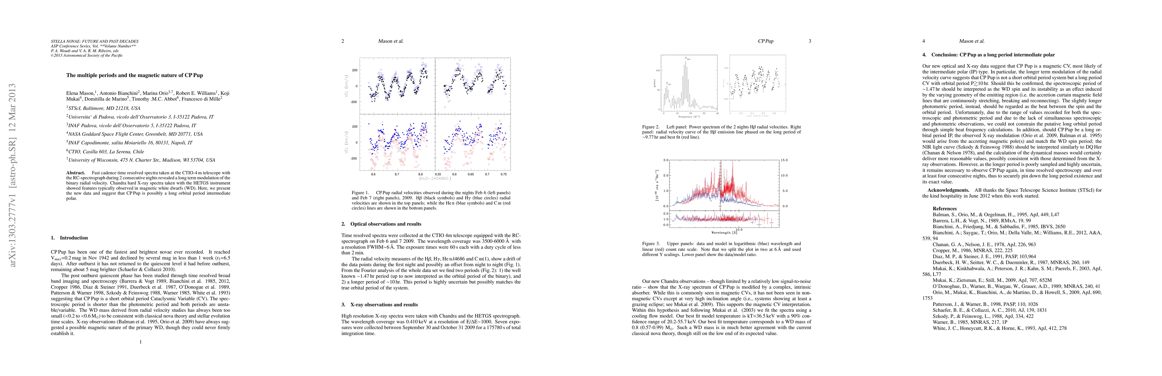 Fast cadence time resolved spectra taken at the CTIO-4m telescope with the RC-spectrograph during 2 consecutive nights revealed a long term modulation of the binary radial velocity. Chandra hard X-ray spectra taken with the HETGS instrument showed features typically observed in magnetic white dwarfs (WD). Here, we present the new data and suggest that CP Pup is possibly a long orbital period intermediate polar.