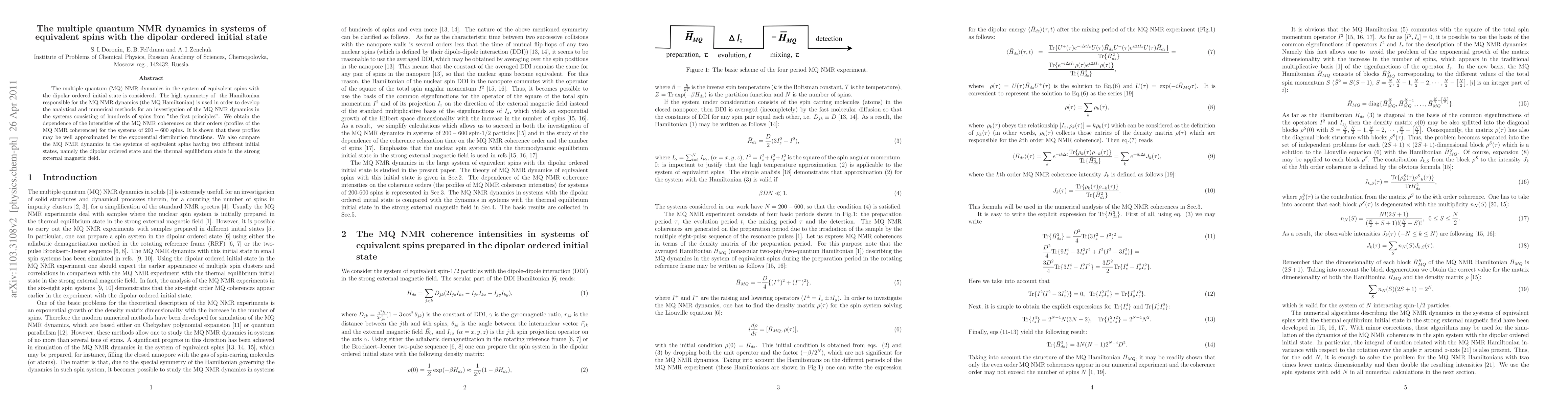 The multiple quantum (MQ) NMR dynamics in the system of equivalent spins with the dipolar ordered initial state is considered. The high symmetry of the MQ Hamiltonian is used in order to develop the analytical and numerical methods for an investigation of the MQ NMR dynamics in the systems consisting of hundreds of spins from "the first principles". We obtain the dependence of the intensities of the MQ NMR coherences on their orders (profiles of the MQ NMR coherences) for the systems of $200 - 600$ spins. It is shown that these profiles may be well approximated by the exponential distribution functions. We also compare the MQ NMR dynamics in the systems of equivalent spins having two different initial states, namely the dipolar ordered state and the thermal equilibrium state in the strong external magnetic field.