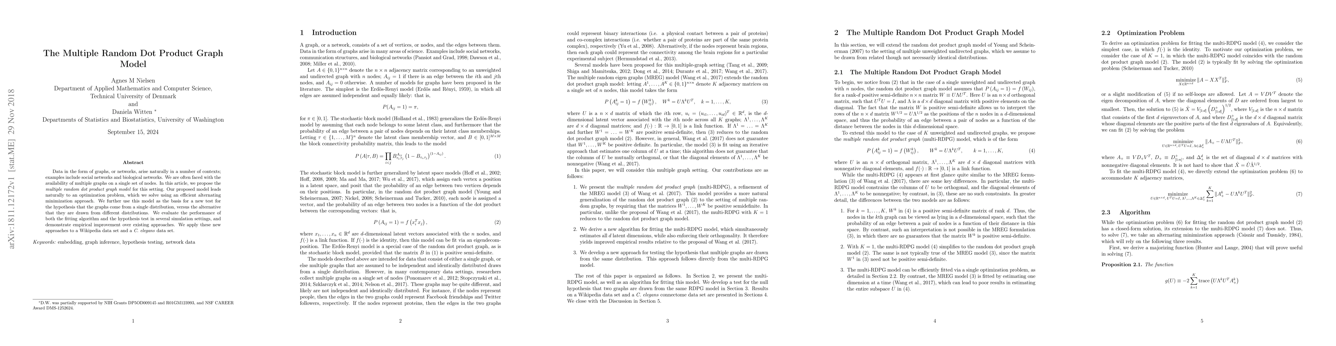 Data in the form of graphs, or networks, arise naturally in a number of contexts; examples include social networks and biological networks. We are often faced with the availability of multiple graphs on a single set of nodes. In this article, we propose the multiple random dot product graph model for this setting. Our proposed model leads naturally to an optimization problem, which we solve using an efficient alternating minimization approach. We further use this model as the basis for a new test for the hypothesis that the graphs come from a single distribution, versus the alternative that they are drawn from different distributions. We evaluate the performance of both the fitting algorithm and the hypothesis test in several simulation settings, and demonstrate empirical improvement over existing approaches. We apply these new approaches to a Wikipedia data set and a C. elegans data set.