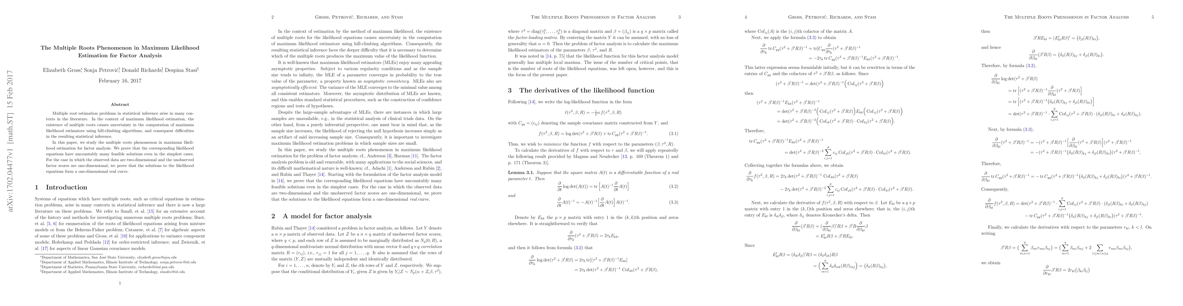 This paper investigates the multiple roots phenomenon in maximum likelihood estimation for factor analysis, demonstrating that the likelihood equations have uncountably many feasible solutions, leading to challenges in statistical inference. Specifically, for two-dimensional observed data and one-dimensional unobserved factor scores, the solutions form a one-dimensional real curve.