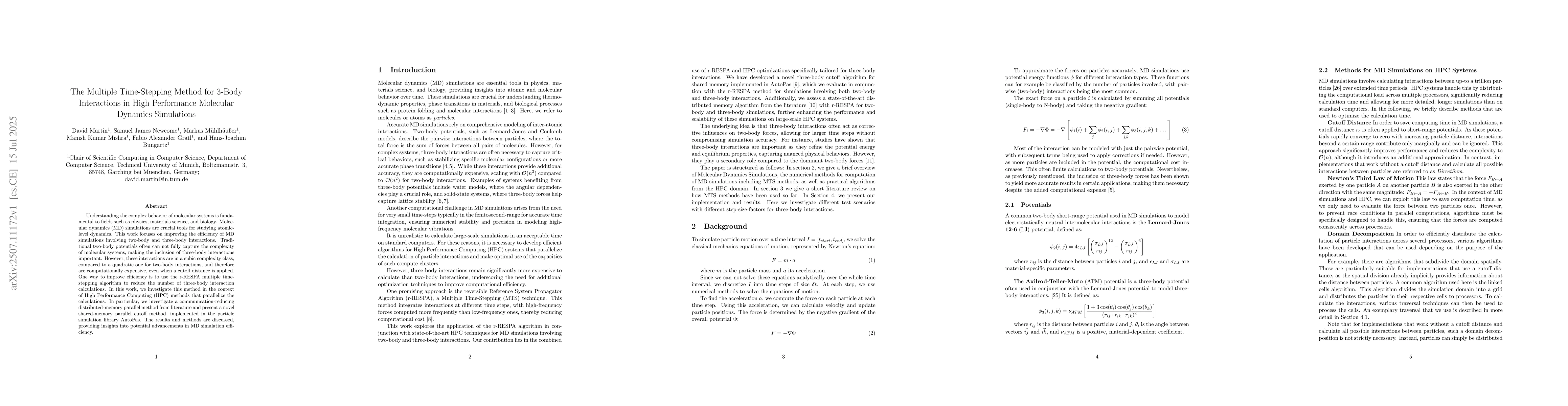 Understanding the complex behavior of molecular systems is fundamental to fields such as physics, materials science, and biology. Molecular dynamics (MD) simulations are crucial tools for studying atomic-level dynamics. This work focuses on improving the efficiency of MD simulations involving two-body and three-body interactions. Traditional two-body potentials often can not fully capture the complexity of molecular systems, making the inclusion of three-body interactions important. However, these interactions are in a cubic complexity class, compared to a quadratic one for two-body interactions, and therefore are computationally expensive, even when a cutoff distance is applied. One way to improve efficiency is to use the r-RESPA multiple time-stepping algorithm to reduce the number of three-body interaction calculations. In this work, we investigate this method in the context of High Performance Computing (HPC) methods that parallelize the calculations. In particular, we investigate a communication-reducing distributed-memory parallel method from literature and present a novel shared-memory parallel cutoff method, implemented in the particle simulation library AutoPas. The results and methods are discussed, providing insights into potential advancements in MD simulation efficiency.