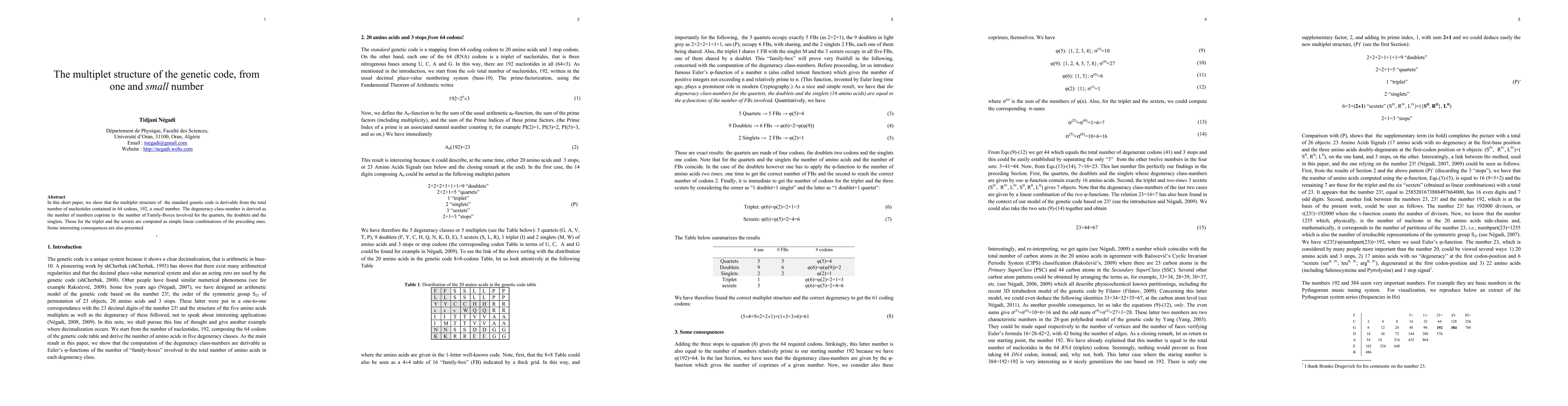 In this short paper, it is shown that the multiplet structure of the standard genetic code is derivable from the total number of nucleotides contained in 64 codons, 192, a small number. The degeneracy class-number is derived as the number of numbers coprime to the number of Family-Boxes involved for the quartets, the doublets and the singlets. Those for the triplet and the sextets are computed as simple linear combinations of the preceeding ones. Some interesting consequences are also presented.