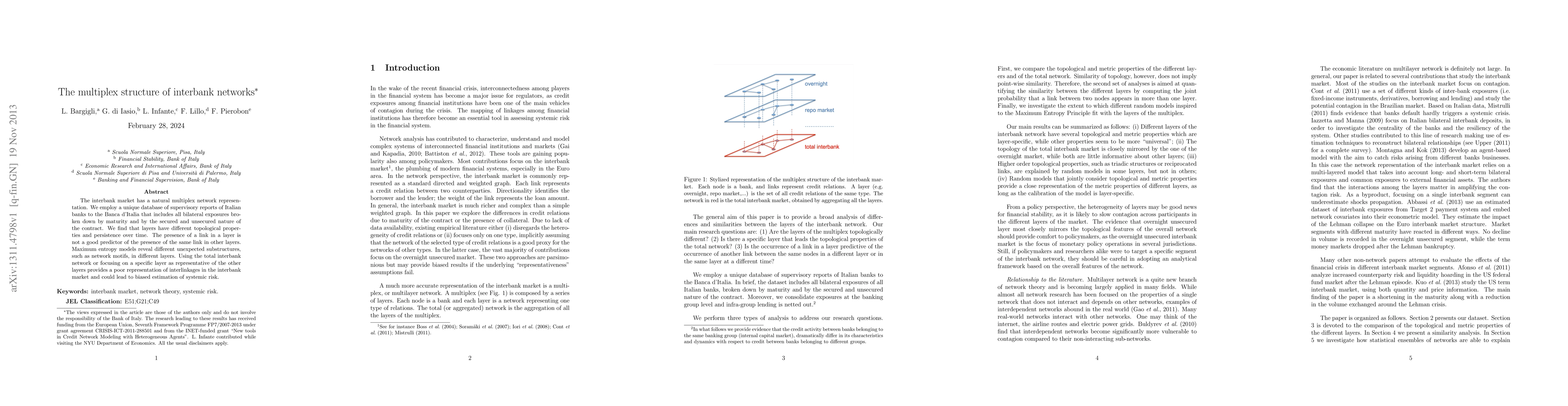 The interbank market has a natural multiplex network representation. We employ a unique database of supervisory reports of Italian banks to the Banca d'Italia that includes all bilateral exposures broken down by maturity and by the secured and unsecured nature of the contract. We find that layers have different topological properties and persistence over time. The presence of a link in a layer is not a good predictor of the presence of the same link in other layers. Maximum entropy models reveal different unexpected substructures, such as network motifs, in different layers. Using the total interbank network or focusing on a specific layer as representative of the other layers provides a poor representation of interlinkages in the interbank market and could lead to biased estimation of systemic risk.