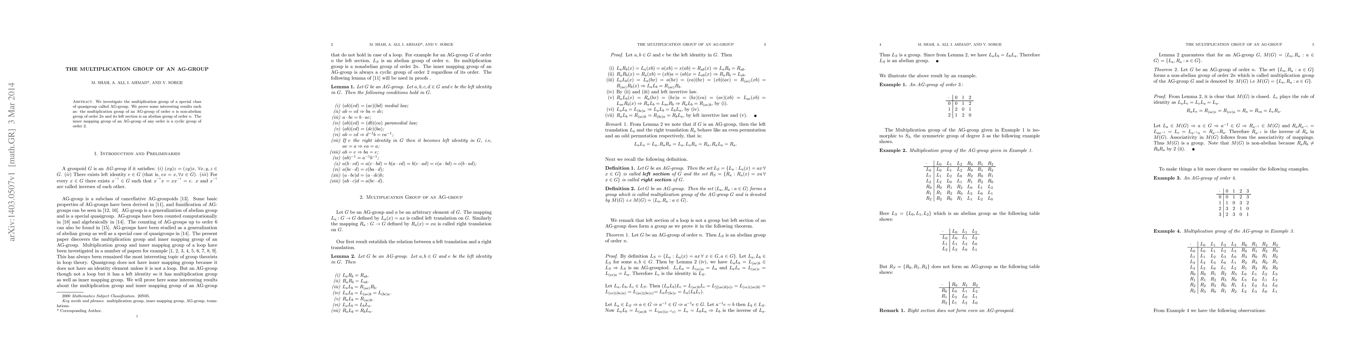 We investigate the multiplication group of a special class of quasigroup called AG-group. We prove some interesting results such as: the multiplication group of an AG-group of order n is non-abelian group of order 2n and its left section is an abelian group of order n. The inner mapping group of an AG-group of any order is a cyclic group of order 2.