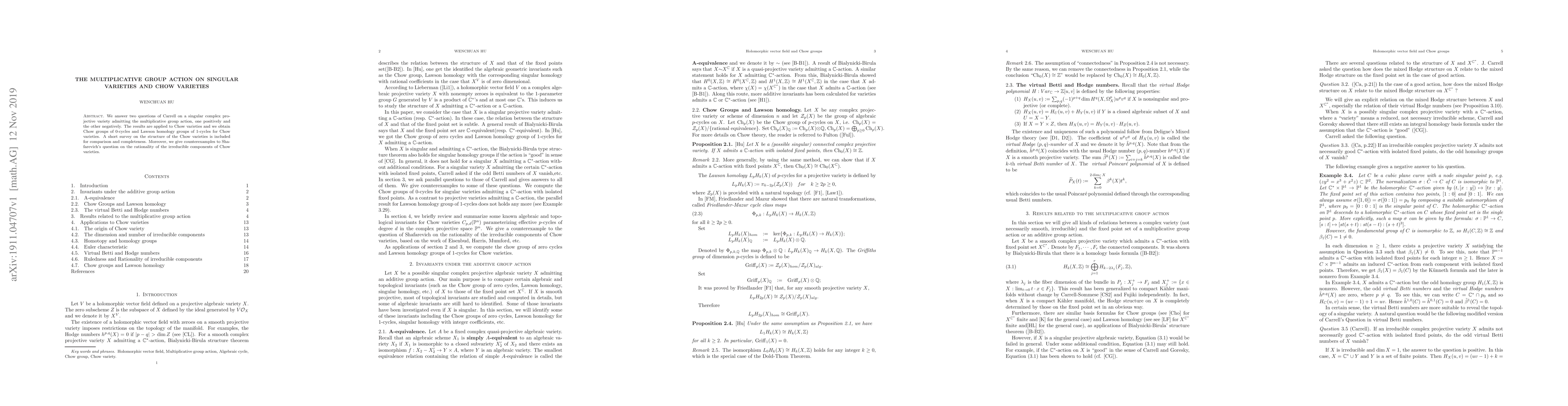 This paper resolves two questions posed by Carrell regarding the multiplicative group action on singular complex projective varieties, providing both positive and negative results. It applies these findings to Chow varieties, deriving Chow groups of 0-cycles and Lawson homology groups of 1-cycles, and includes a survey on Chow varieties for context, while also refuting Shafarevich's question on the rationality of their components.