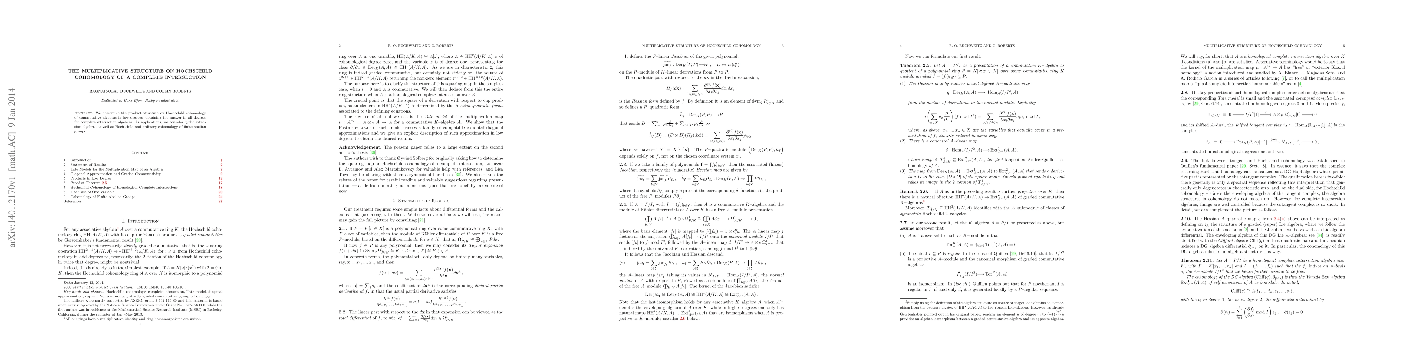 We determine the product structure on Hochschild cohomology of commutative algebras in low degrees, obtaining the answer in all degrees for complete intersection algebras. As applications, we consider cyclic extension algebras as well as Hochschild and ordinary cohomology of finite abelian groups.