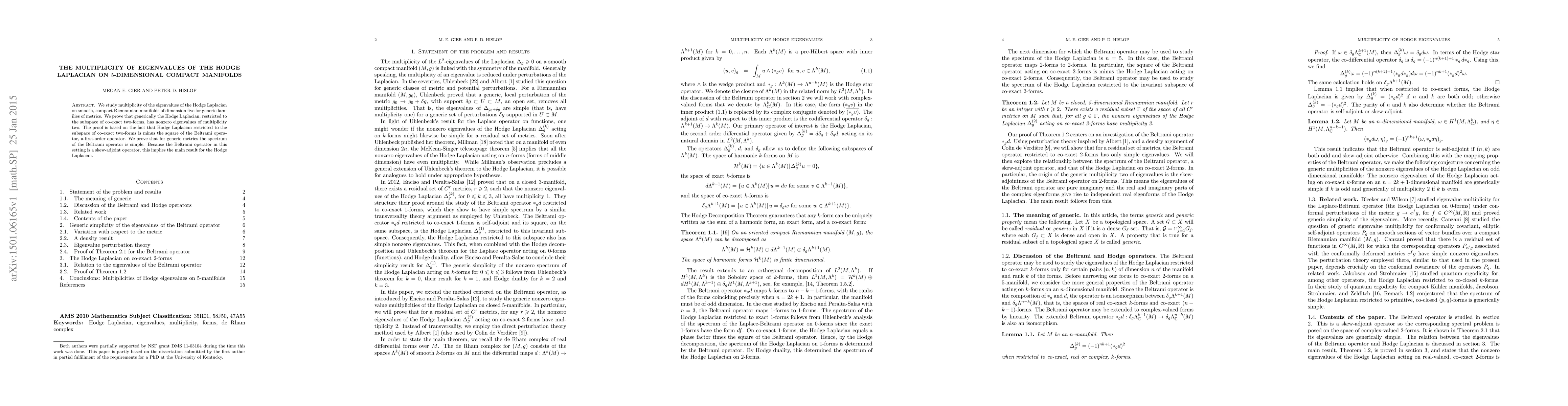 This paper investigates the eigenvalue multiplicity of the Hodge Laplacian on 5-dimensional compact manifolds, proving that generically, the Hodge Laplacian has nonzero eigenvalues of multiplicity two. The result is derived from the properties of the Beltrami operator, which is shown to have a simple spectrum for generic metrics.