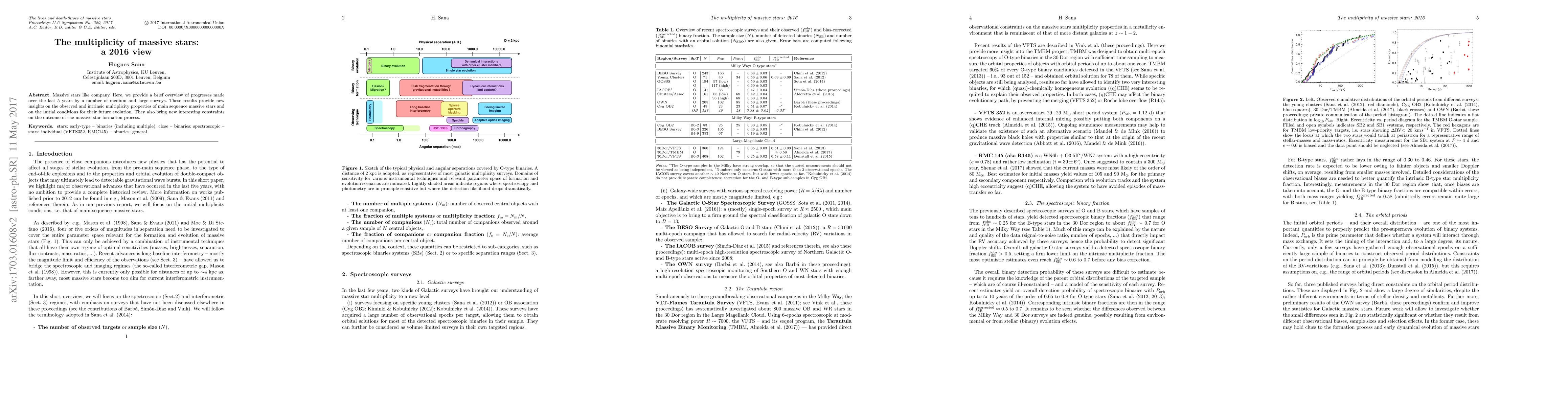 Massive stars like company. Here, we provide a brief overview of progresses made over the last 5 years by a number of medium and large surveys. These results provide new insights on the observed and intrinsic multiplicity properties of main sequence massive stars and on the initial conditions for their future evolution. They also bring new interesting constraints on the outcome of the massive star formation process.