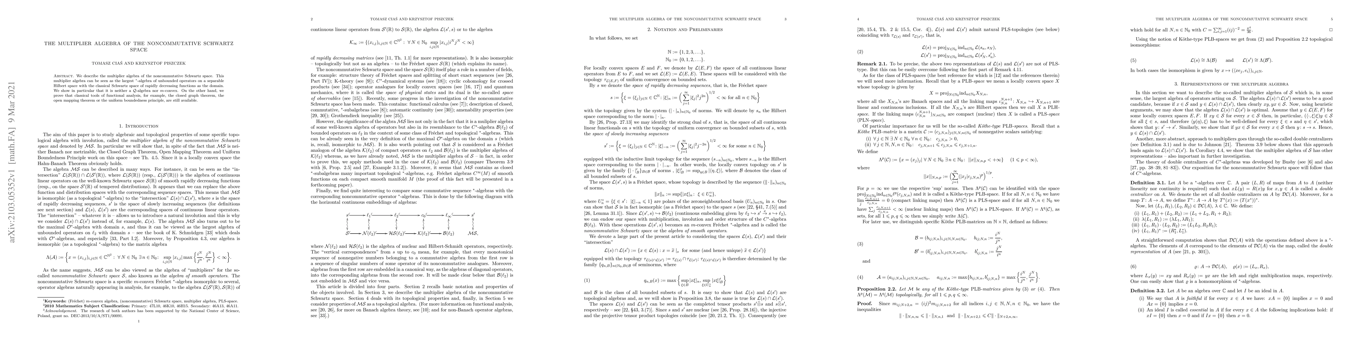 We describe the multiplier algebra of the noncommutative Schwartz space. This multiplier algebra can be seen as the largest ${}^*$-algebra of unbounded operators on a separable Hilbert space with the classical Schwartz space of rapidly decreasing functions as the domain. We show in particular that it is neither a $\mathcal{Q}$-algebra nor $m$-convex. On the other hand, we prove that classical tools of functional analysis, for example, the closed graph theorem, the open mapping theorem or the uniform boundedness principle, are still available.