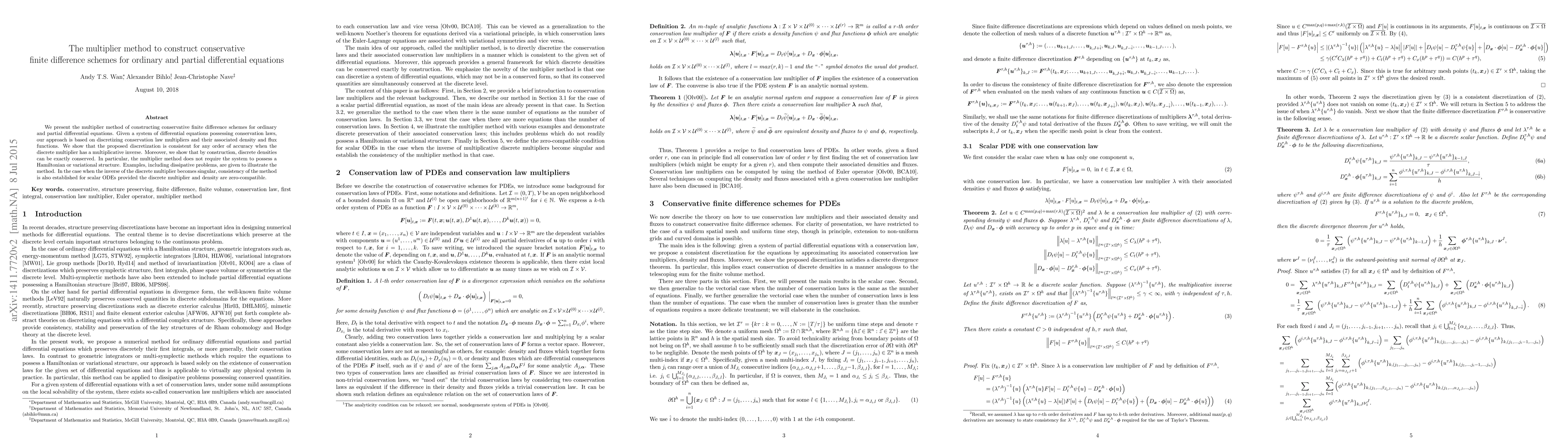 Researchers present a new method to construct conservative finite difference schemes for ordinary and partial differential equations without requiring Hamiltonian or variational structure. The method ensures exact conservation of discrete densities under certain conditions.