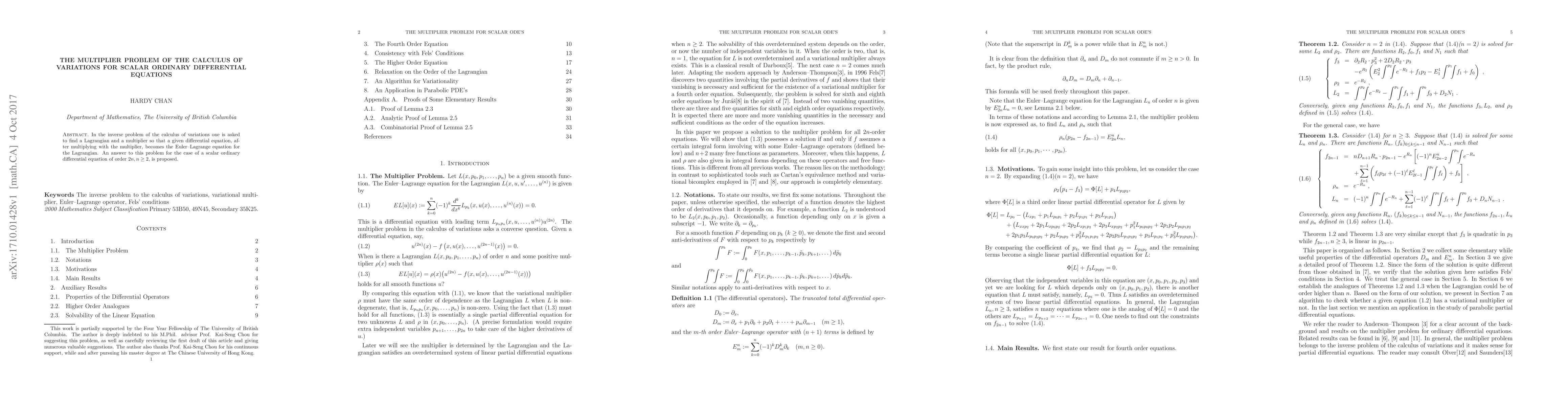 In the inverse problem of the calculus of variations one is asked to find a Lagrangian and a multiplier so that a given differential equation, after multiplying with the multiplier, becomes the Euler--Lagrange equation for the Lagrangian. An answer to this problem for the case of a scalar ordinary differential equation of order $2n, n\geq 2,$ is proposed.