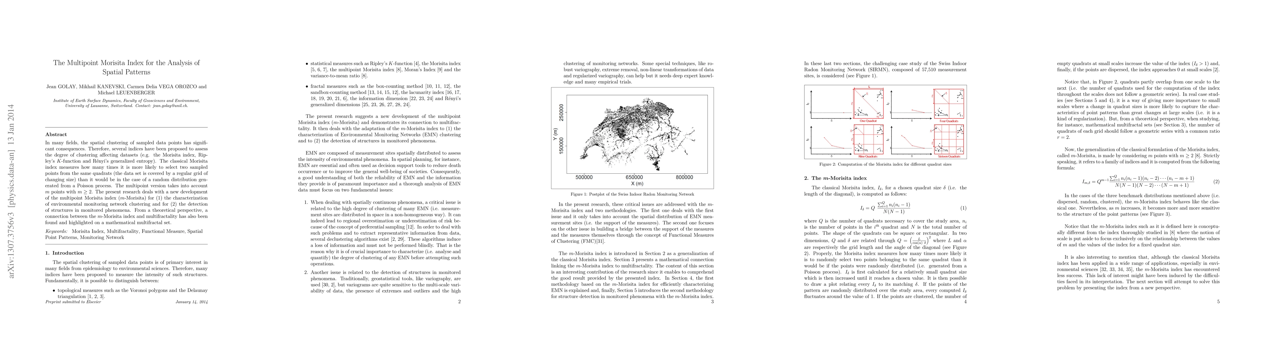In many fields, the spatial clustering of sampled data points has many consequences. Therefore, several indices have been proposed to assess the level of clustering affecting datasets (e.g. the Morisita index, Ripley's K-function and R\'enyi's generalized entropy). The classical Morisita index measures how many times it is more likely to select two measurement points from the same quadrats (the data set is covered by a regular grid of changing size) than it would be in the case of a random distribution generated from a Poisson process. The multipoint version (k-Morisita) takes into account k points with k greater than or equal to 2. The present research deals with a new development of the k-Morisita index for (1) monitoring network characterization and for (2) the detection of patterns in monitored phenomena. From a theoretical perspective, a connection between the k-Morisita index and multifractality has also been found and highlighted on a mathematical multifractal set.