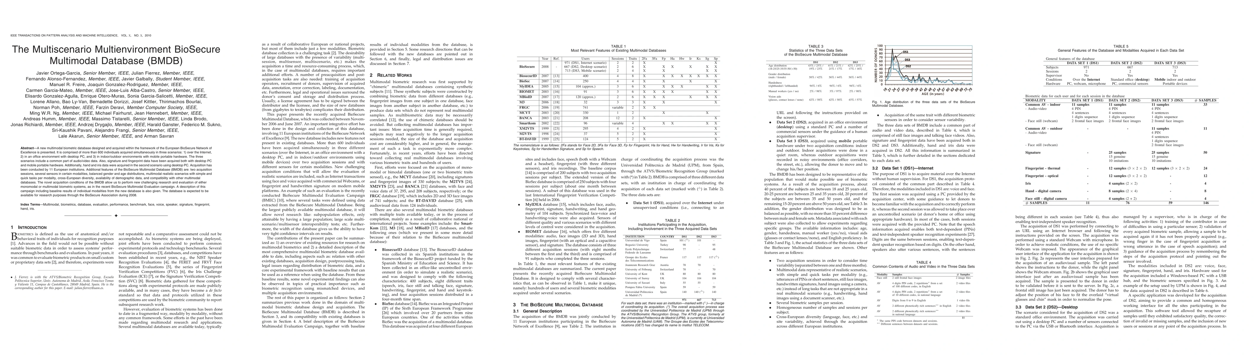 The BioSecure Multimodal Database (BMDB) comprises biometric data from over 600 individuals collected across three diverse scenarios, enabling research on both monomodal and multimodal biometric systems. The database includes audio/video, signature, and fingerprint data from various environments and devices, with balanced demographic distributions and compatibility with other multimodal databases.