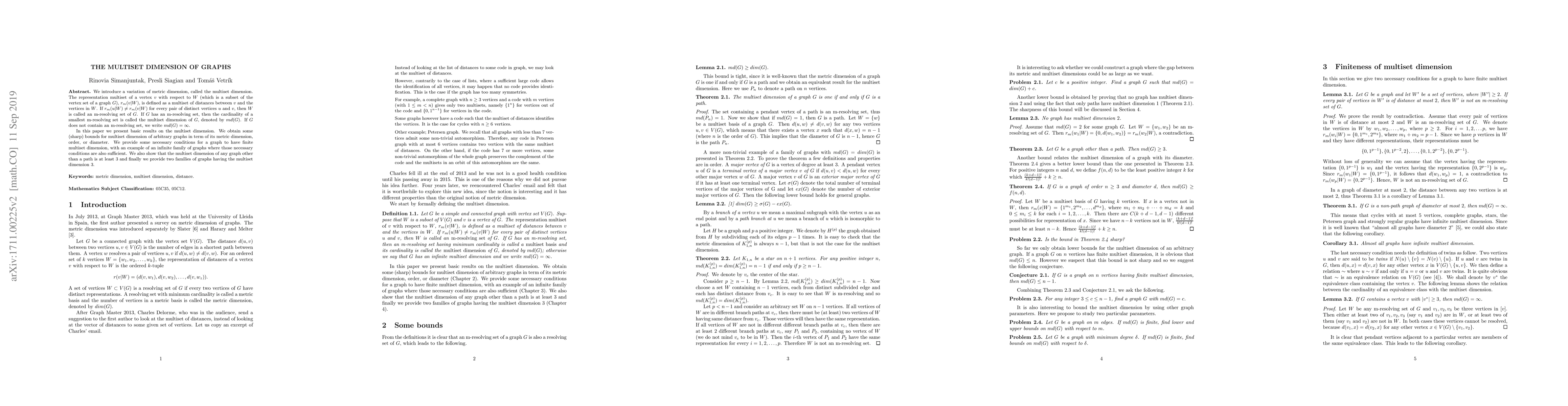 This paper introduces the concept of multiset dimension in graph theory, defining it as the smallest cardinality of an m-resolving set that uniquely identifies all vertices via multiset representations of distances. It presents bounds and necessary conditions for finite multiset dimension and demonstrates that non-path graphs have a multiset dimension of at least 3.