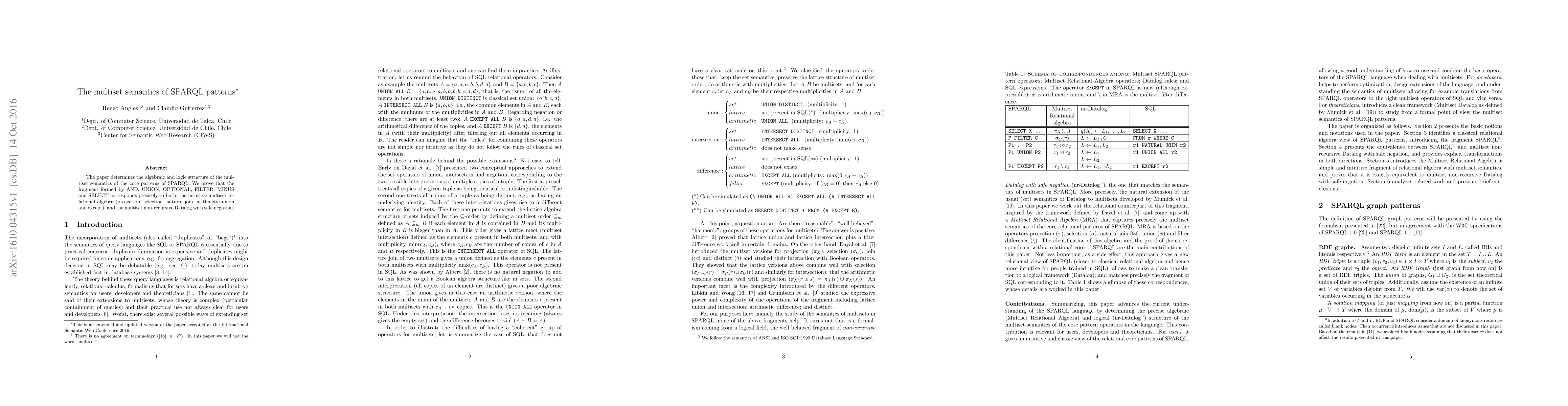 The paper establishes the algebraic and logical structure of multiset semantics for core SPARQL patterns, proving that the specified fragment aligns with both multiset relational algebra and multiset non-recursive Datalog with safe negation. This correspondence enhances the understanding of SPARQL's operational semantics.