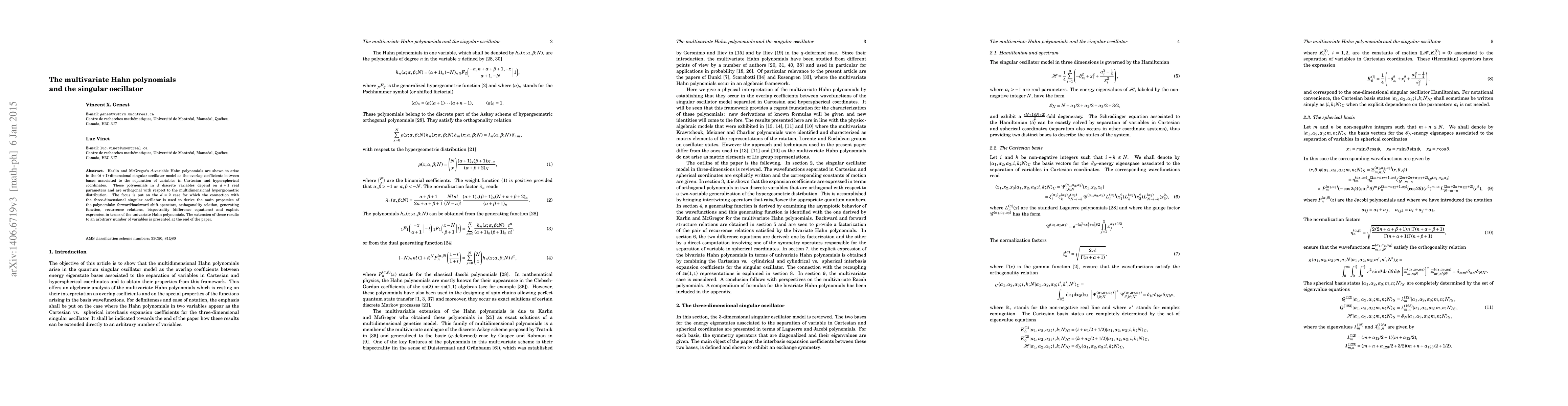 This paper explores the connection between Karlin and McGregor's d-variable Hahn polynomials and the (d+1)-dimensional singular oscillator, demonstrating their role as overlap coefficients in Cartesian and hyperspherical coordinates. The study focuses on the d=2 case to derive the polynomials' properties, including shift operators, orthogonality, generating functions, recurrence relations, and bispectrality.