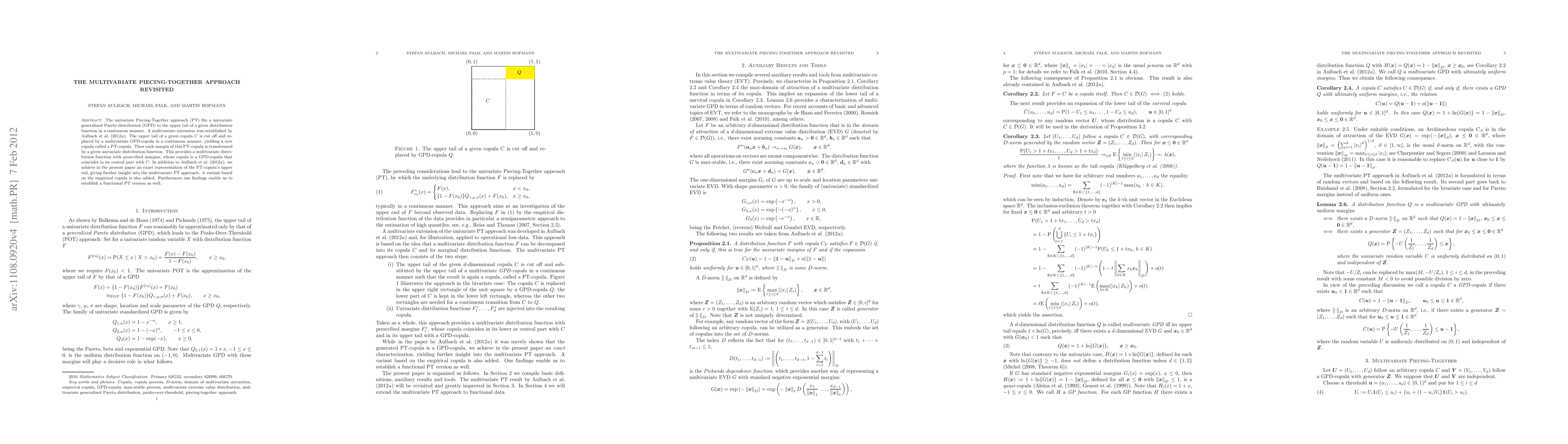 The univariate Piecing-Together approach (PT) fits a univariate generalized Pareto distribution (GPD) to the upper tail of a given distribution function in a continuous manner. A multivariate extension was established by Aulbach et al. (2012a): The upper tail of a given copula C is cut off and replaced by a multivariate GPD-copula in a continuous manner, yielding a new copula called a PT-copula. Then each margin of this PT-copula is transformed by a given univariate distribution function. This provides a multivariate distribution function with prescribed margins, whose copula is a GPD-copula that coincides in its central part with C. In addition to Aulbach et al. (2012a), we achieve in the present paper an exact representation of the PT-copula's upper tail, giving further insight into the multivariate PT approach. A variant based on the empirical copula is also added. Furthermore our findings enable us to establish a functional PT version as well.