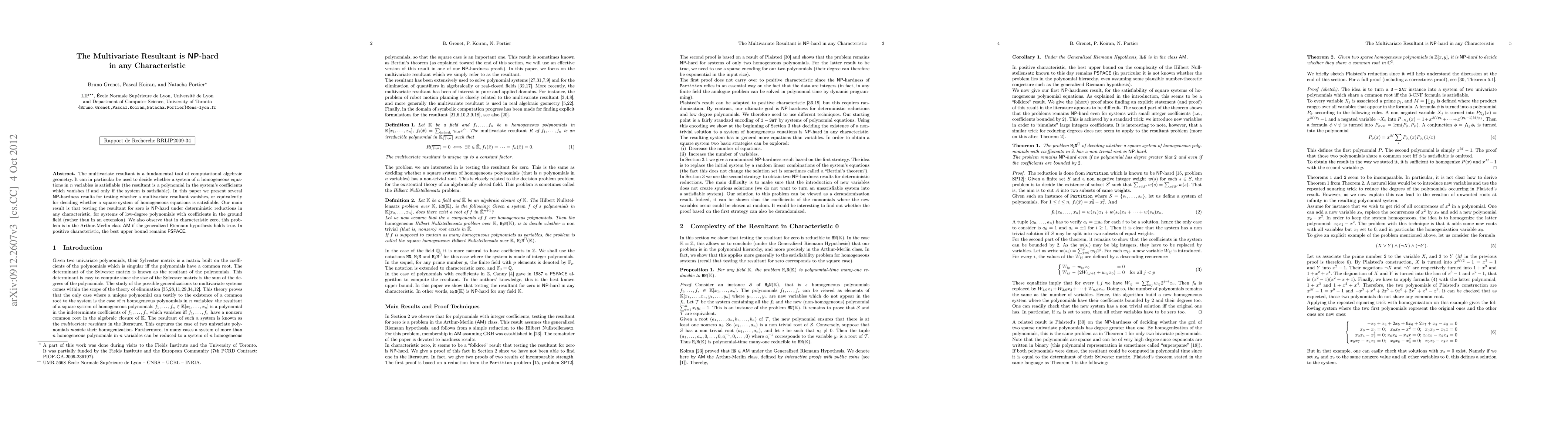 This paper demonstrates that testing the vanishing of a multivariate resultant, which is crucial for determining the satisfiability of a system of homogeneous polynomial equations, is NP-hard under deterministic reductions in any characteristic. Additionally, the authors note that in characteristic zero, the problem may lie in the AM class if the generalized Riemann hypothesis is valid.
