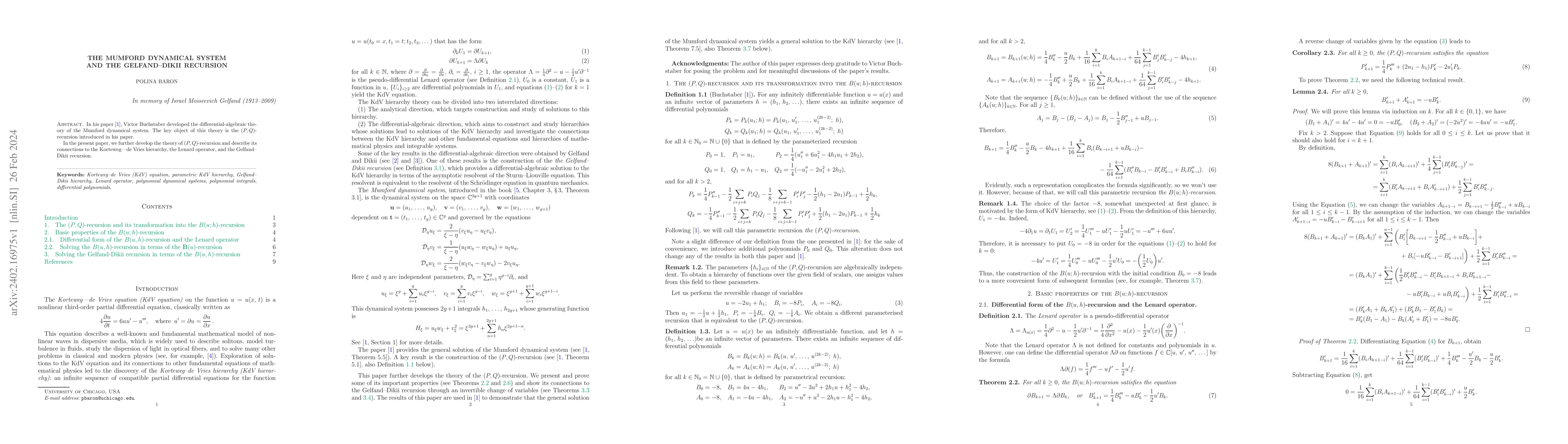 Summary: This paper extends the differential-algebraic theory of the Mumford dynamical system by exploring the (P,Q)-recursion and its connections to the Korteweg-de Vries hierarchy, the Lenard operator, and the Gelfand-Dikii recursion.