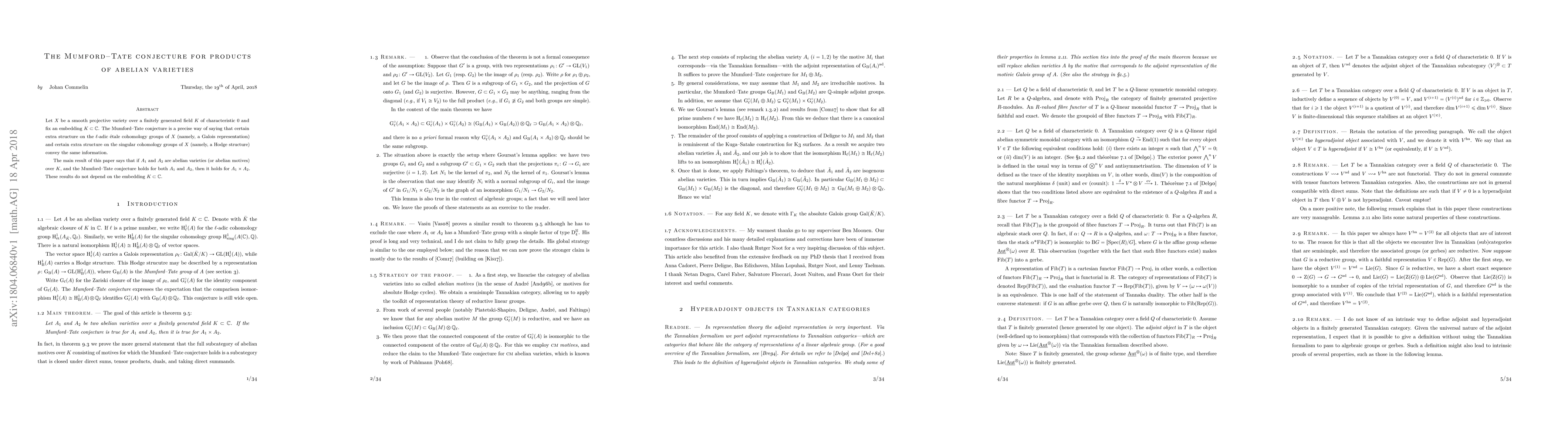Let $X$ be a smooth projective variety over a finitely generated field $K$ of characteristic~$0$ and fix an embedding $K \subset \mathbb{C}$. The Mumford--Tate conjecture is a precise way of saying that certain extra structure on the $\ell$-adic \'etale cohomology groups of~$X$ (namely, a Galois representation) and certain extra structure on the singular cohomology groups of~$X$ (namely, a Hodge structure) convey the same information. The main result of this paper says that if $A_1$ and~$A_2$ are abelian varieties (or abelian motives) over~$K$, and the Mumford--Tate conjecture holds for both~$A_1$ and~$A_2$, then it holds for $A_1 \times A_2$. These results do not depend on the embedding $K \subset \CC$.