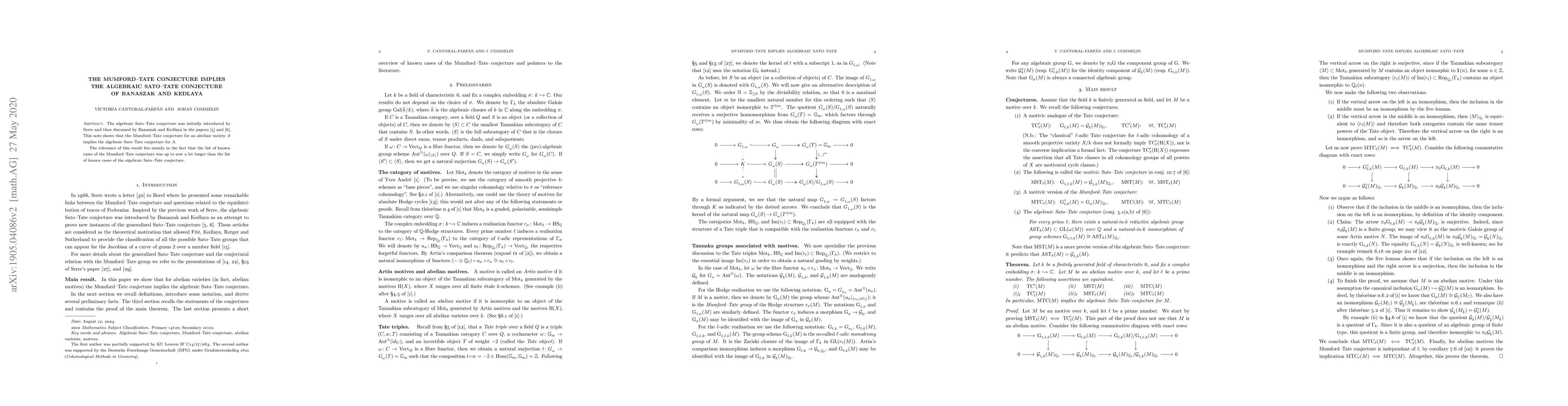 This paper demonstrates that the Mumford-Tate conjecture for an abelian variety A implies the algebraic Sato-Tate conjecture for A, enhancing the known cases of the latter. The significance lies in extending the cases of the algebraic Sato-Tate conjecture using the more established Mumford-Tate conjecture.