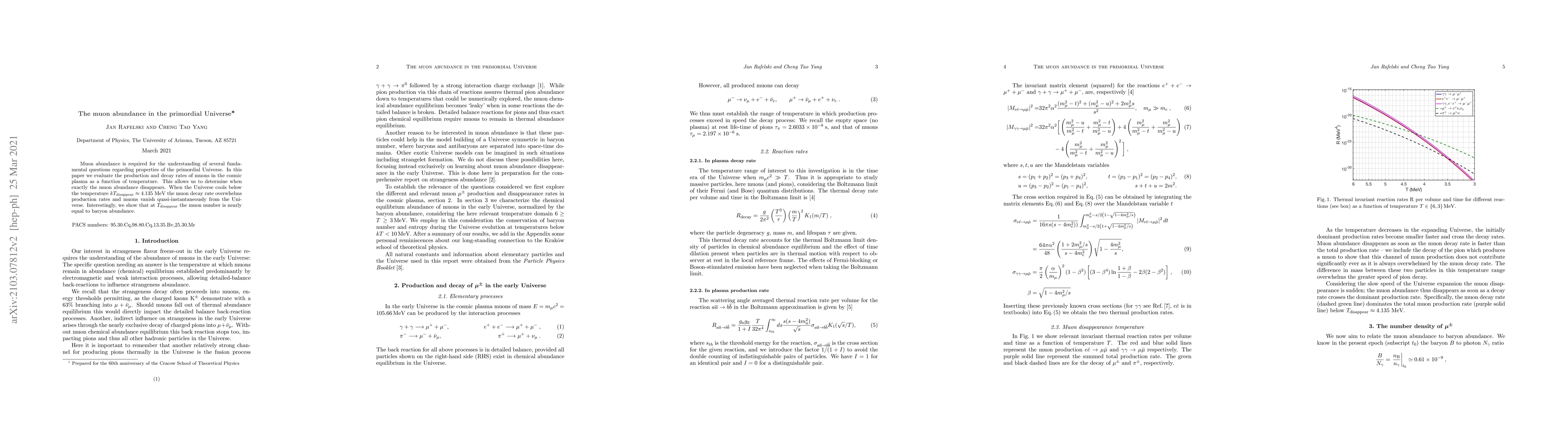 Muon abundance is required for the understanding of several fundamental questions regarding properties of the primordial Universe. In this paper we evaluate the production and decay rates of muons in the cosmic plasma as a function of temperature. This allows us to determine when exactly the muon abundance disappears. When the Universe cools below the temperature $kT_\mathrm{disappear}\approx 4.135$ MeV the muon decay rate overwhelms production rates and muons vanish quasi-instantaneously from the Universe. Interestingly, we show that at $T_\mathrm{disappear}$ the muon number is nearly equal to baryon abundance.