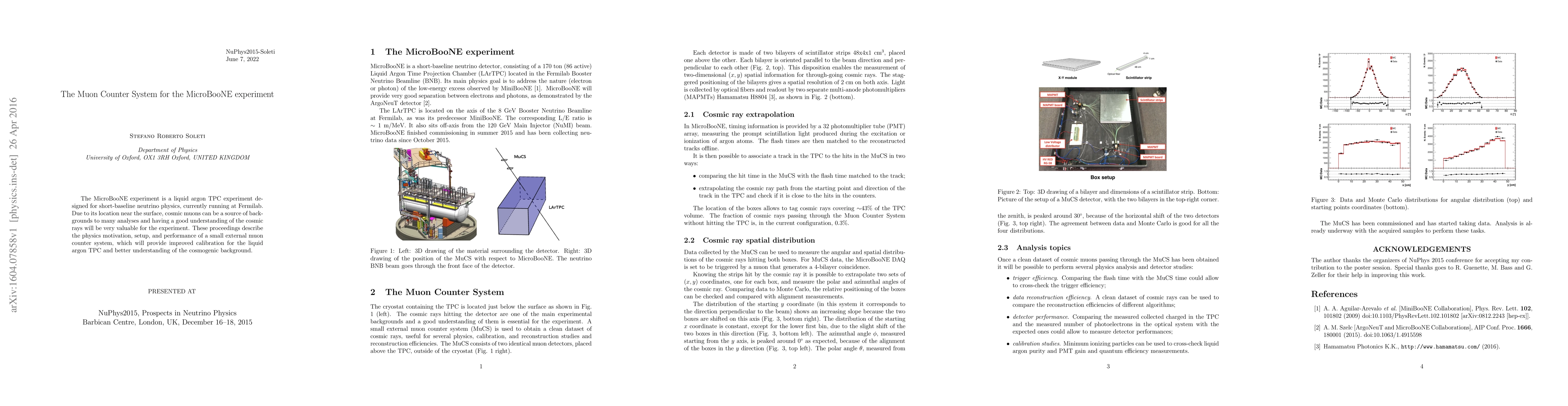 The MicroBooNE experiment employs a liquid argon TPC to study short-baseline neutrino physics, facing challenges from cosmic muons. An external muon counter system has been developed to enhance calibration and reduce cosmogenic background, improving the experiment's overall data quality.