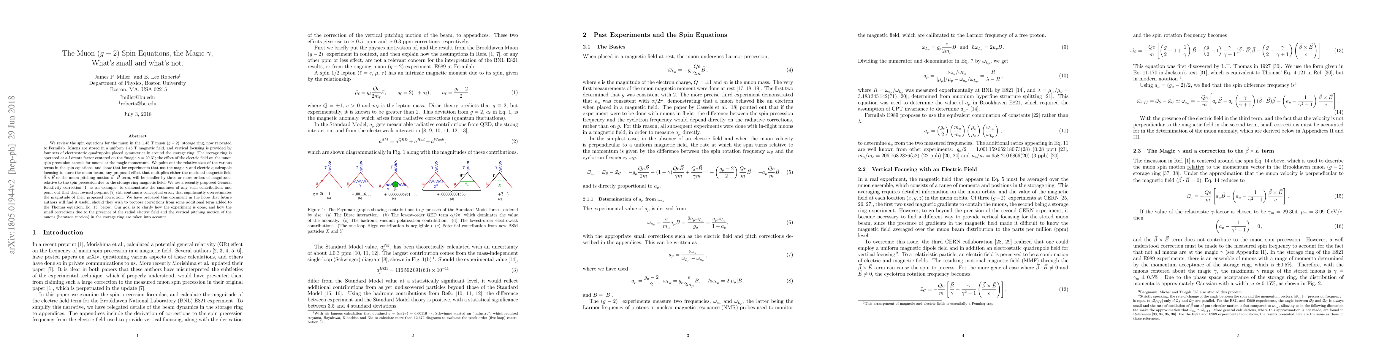 We review the spin equations for the muon in the 1.45~T muon storage ring at Brookhaven National Laboratory, which has subsequently been relocated to Fermilab. Muons are stored in a uniform 1.45~T magnetic field, and vertical focusing is provided by four sets of electrostatic quadrupoles placed symmetrically around the storage ring. The storage ring is operated at the "magic $\gamma = 29.3$" so that the effect of the motional magnetic field cancels for muons at the magic momentum. We point out the relative sizes of the various terms in the spin equations, and show that for experiments that use the magic $\gamma$ and electric quadrupole focusing to store the muon beam, any proposed effect that multiplies either the motional magnetic field $\vec \beta \times \vec E$ or the muon pitching motion $\vec \beta \cdot \vec B$ term, will be smaller by three or more orders of magnitude, relative to the spin precession from the storage ring magnetic field. We use a recently proposed General Relativity correction as an example, to demonstrate the smallness of any such contribution, and point out that the revised preprint from these authors still contains a conceptual error, that significantly overestimates the magnitude of their proposed correction. We have prepared this document in the hope that future authors will find it useful, should they wish to propose corrections from some additional term added to the Thomas equation, Eq. 13, below. Our goal is to clarify how the experiment is done, and how the small corrections due to the presence of the radial electric field and the vertical pitching motion of themuons (betatron motion) in the storage ring are taken into account.