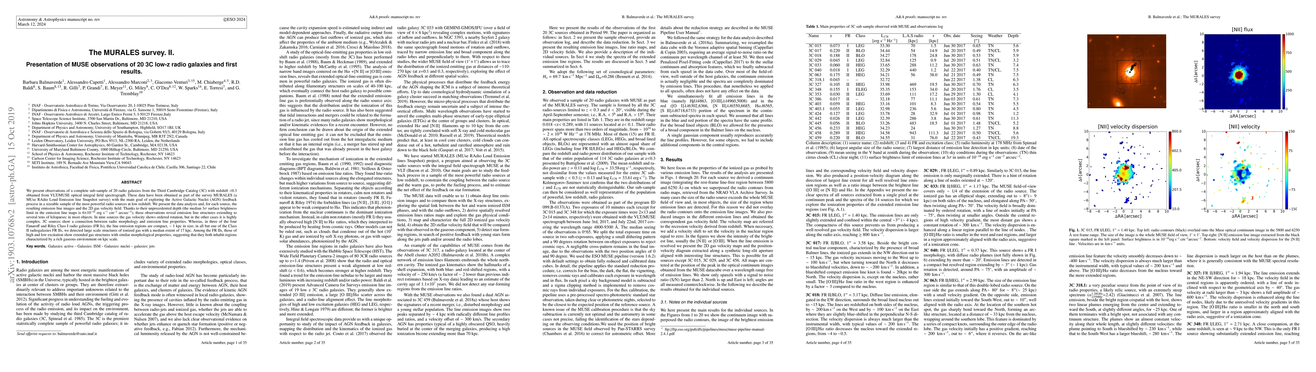 The MURALES survey presents VLT/MUSE observations of 20 low-redshift 3C radio galaxies, revealing unprecedented depth in emission line maps. The study finds that Fanaroff-Riley Class I (FRI) sources have compact line emission regions (~1 kpc), while FRII sources exhibit large-scale ionized gas structures (median extent of 17 kpc). Both high and low excitation FRII sources show similar extended gas structure morphologies, indicating a rich gaseous environment on kpc scales.