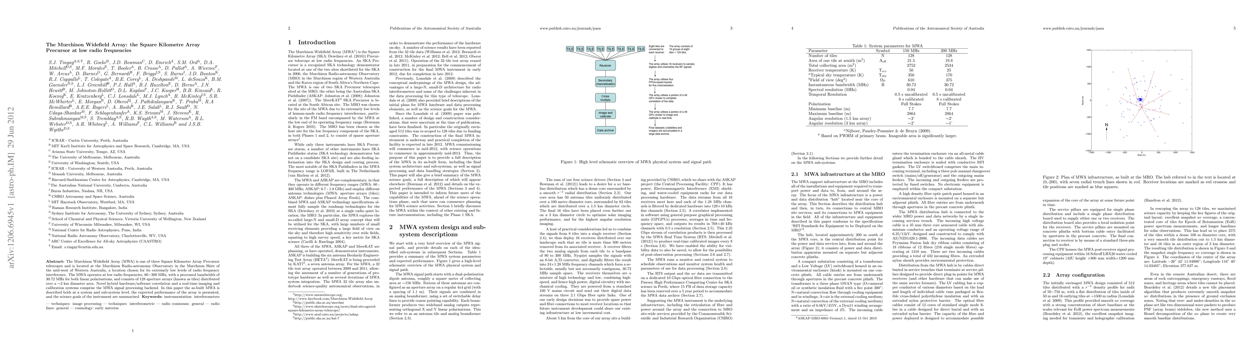 The Murchison Widefield Array (MWA) serves as a precursor to the Square Kilometre Array, operating at low radio frequencies (80-300 MHz) in Western Australia to minimize interference. It comprises 128 aperture arrays with advanced signal processing and calibration systems, aiming to achieve high performance and support various scientific goals.