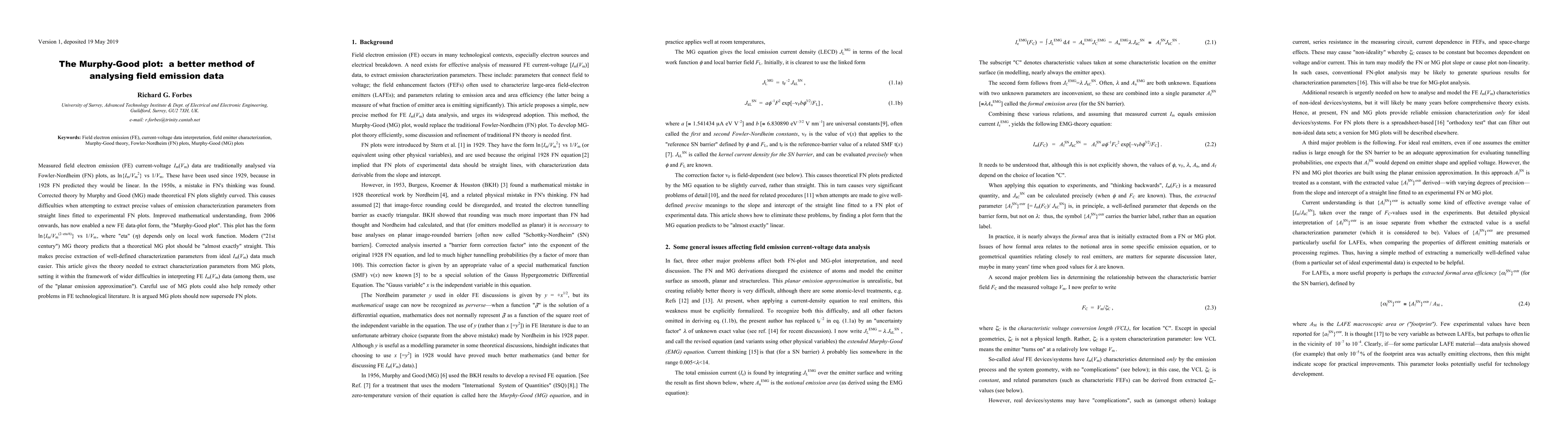 The Murphy-Good plot offers a more accurate method for analyzing field electron emission data compared to traditional Fowler-Nordheim plots, as it predicts almost straight lines, facilitating precise extraction of emission parameters. This new approach should replace the outdated Fowler-Nordheim method to improve the interpretation of field emission data.