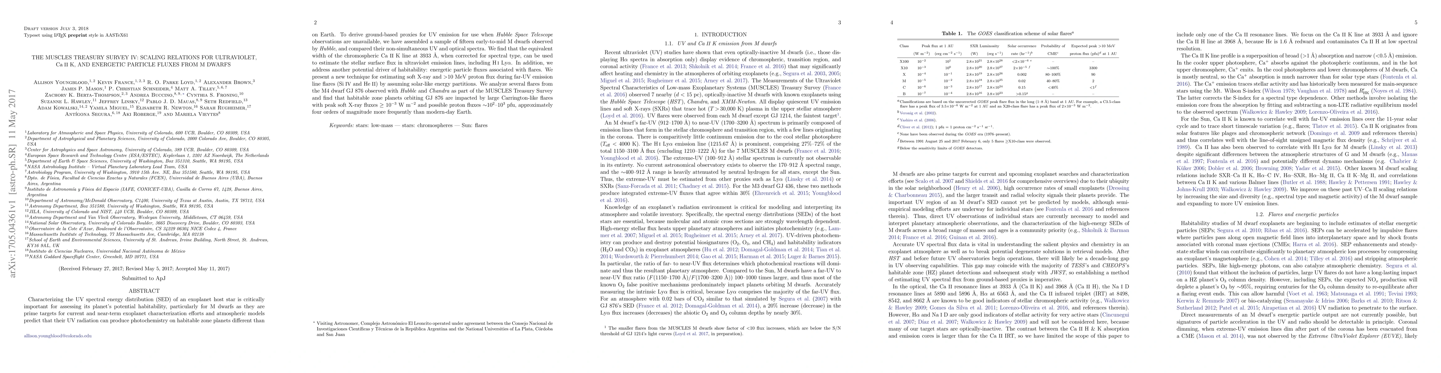 This paper investigates the UV spectral energy distribution of M dwarf stars and finds that the Ca II K line can estimate UV emission flux. It also introduces a method to estimate energetic particle fluxes from flares, revealing that planets around M dwarfs like GJ 876 experience significantly higher energetic particle fluxes than Earth.