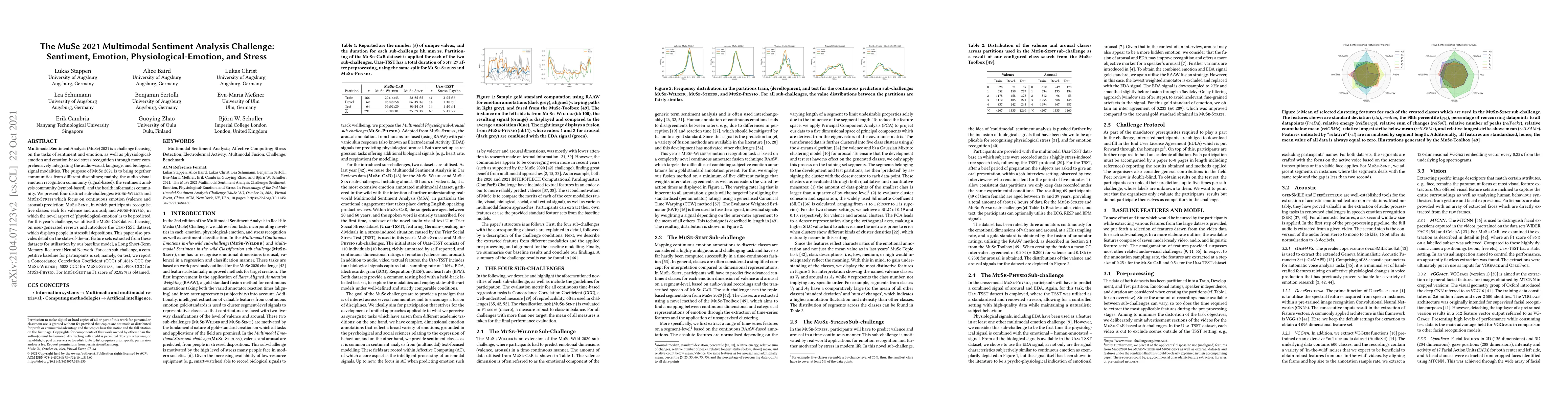 The MuSe 2021 Multimodal Sentiment Analysis Challenge integrates audio-visual, language, and biological signals to recognize sentiment, emotion, and stress. It presents four sub-challenges focusing on continuous emotion prediction, discrete valence and arousal recognition, and physiological-emotion prediction, using datasets like MuSe-CaR and Ulm-TSST.
