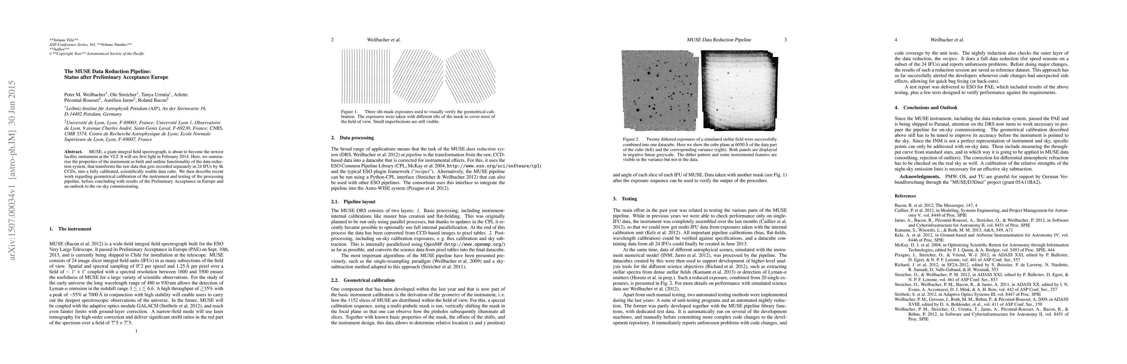 The MUSE data reduction pipeline transforms raw data from the instrument's 24 integral field units into calibrated data cubes, and recent work focused on geometrical calibration and pipeline testing led to Preliminary Acceptance in Europe, with on-sky commissioning upcoming.