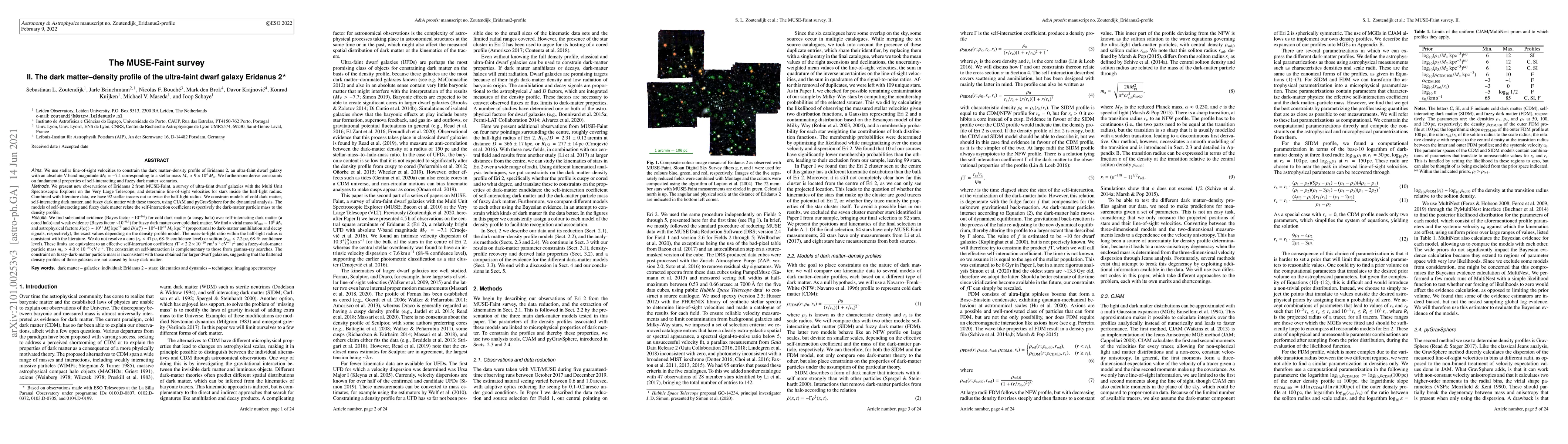 The MUSE-Faint survey investigates the dark matter density profile of the ultra-faint dwarf galaxy Eridanus 2 using stellar velocities, finding strong evidence for cold dark matter and weak evidence for fuzzy dark matter, while placing constraints on self-interaction and fuzzy dark matter particle mass.