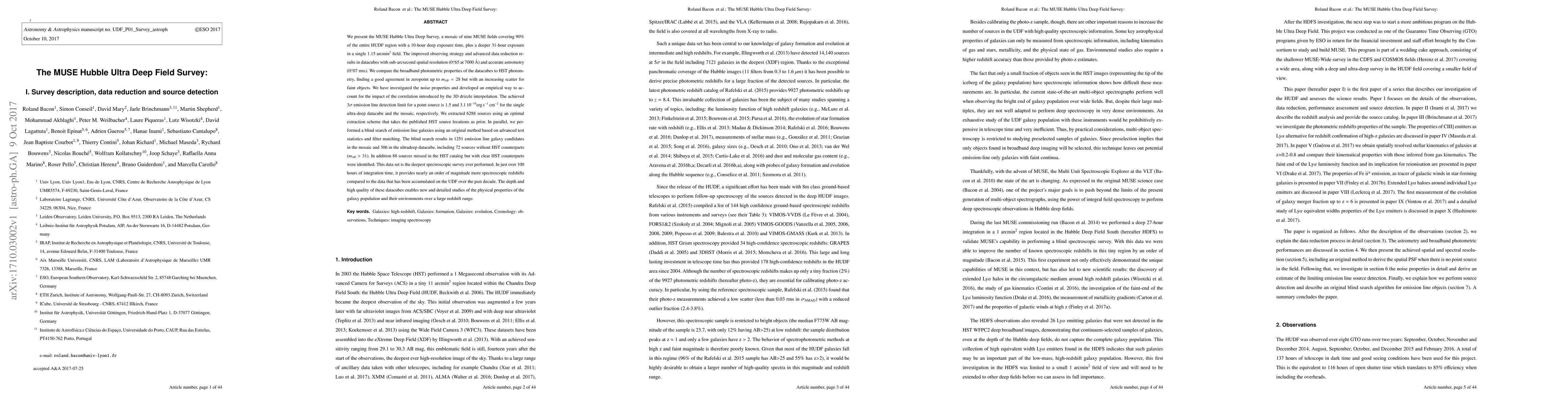 The MUSE Hubble Ultra Deep Field Survey presents a deep spectroscopic survey of the Hubble Ultra Deep Field (HUDF) region, achieving unprecedented depth and resolution. The survey identifies 6288 sources and discovers 1251 emission line galaxies, including 72 faint objects without previous HST counterparts, significantly enhancing the catalog of spectroscopic redshifts.