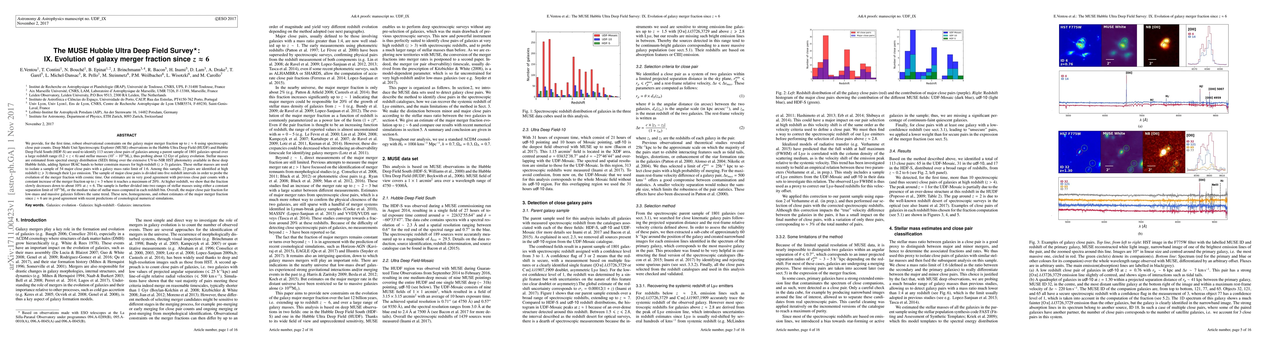 This paper presents the first robust observational constraints on the galaxy major merger fraction up to $z\approx 6$ using MUSE observations in the Hubble Ultra Deep Field. The study identifies 113 secure close pairs among 1801 galaxies, showing a merger fraction that peaks at 20% around $z\approx 3$ and decreases to about 10% at $z\approx 6$.