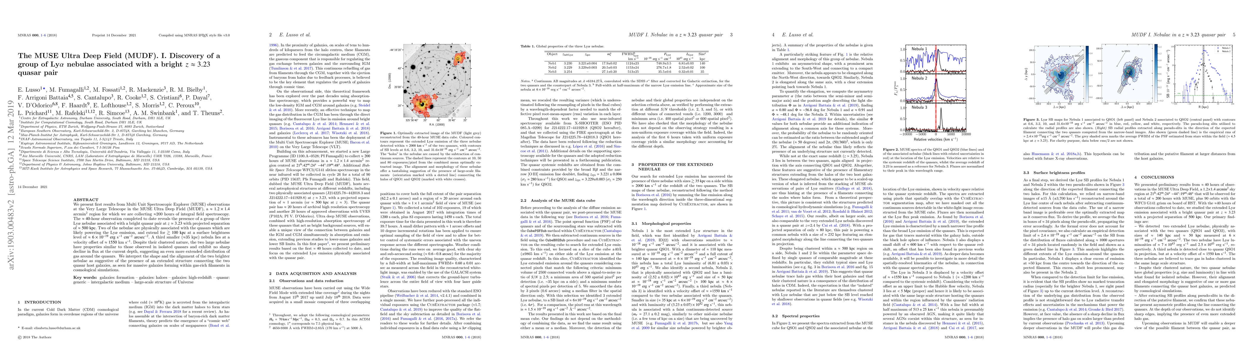 We present first results from Multi Unit Spectroscopic Explorer (MUSE) observations at the Very Large Telescope in the MUSE Ultra Deep Field (MUDF), a $\approx 1.2\times 1.4$ arcmin$^2$ region for which we are collecting $\approx$200 hours of integral field spectroscopy. The $\approx 40$-hour observation completed to date reveals the presence of a group of three Ly$\alpha$ nebulae associated with a bright quasar pair at $z\simeq3.23$ with projected separation of $\approx 500\rm~kpc$. Two of the nebulae are physically associated with the quasars which are likely powering the Ly$\alpha$ emission, and extend for $\gtrsim 100~\rm kpc$ at a surface brightness level of $\approx 6\times 10^{-19}~\rm erg~s^{-1}~cm^{-2}~arcsec^{-2}$. A third smaller ($\approx$35 kpc) nebula lies at a velocity offset of $\approx 1550$ km s$^{-1}$. Despite their clustered nature, the two large nebulae have properties similar to those observed in isolated quasars and exhibit no sharp decline in flux at the current depth, suggesting an even more extended distribution of gas around the quasars. We interpret the shape and the alignment of the two brighter nebulae as suggestive of the presence of an extended structure connecting the two quasar host galaxies, as seen for massive galaxies forming within gas-rich filaments in cosmological simulations.