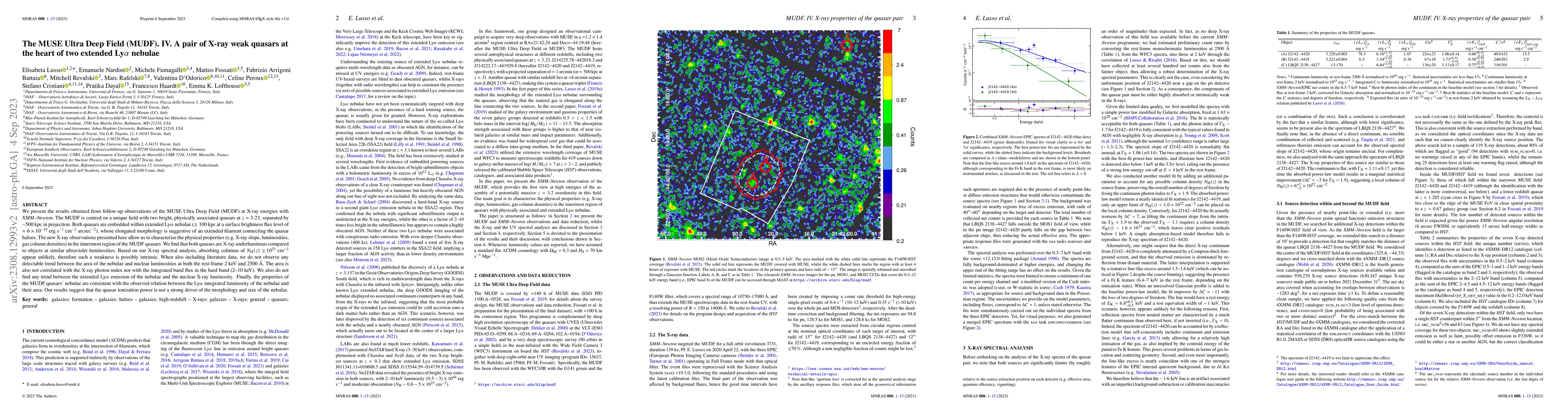 The research utilizes XMM-Newton observations of the MUSE Ultra Deep Field (MUDF) to characterize the physical properties of two X-ray weak quasars at z ~ 3.23, embedded within extended Lyα nebulae (~100 kpc).