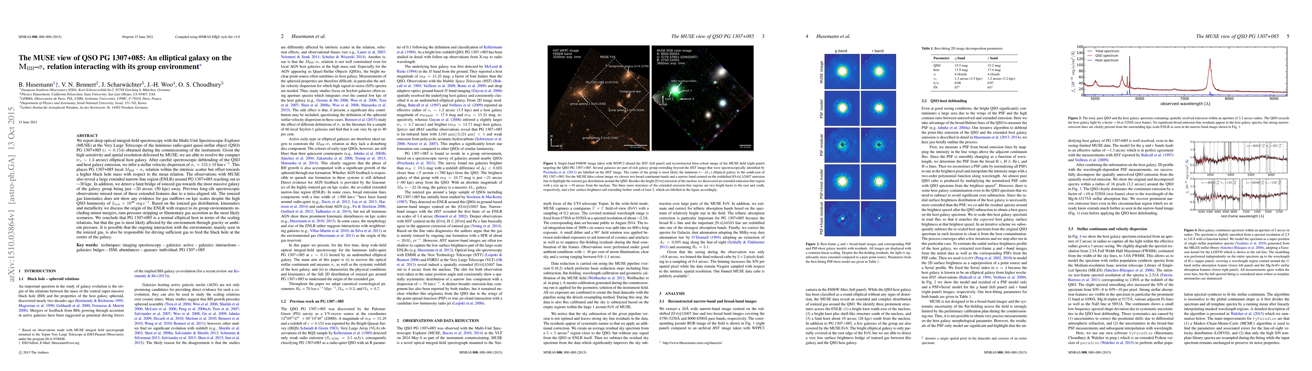 We report deep optical integral-field spectroscopy with the MUSE of the luminous radio-quiet QSO PG1307+085 (z=0.154) obtained during the commissioning of the instrument. Given the high sensitivity and spatial resolution delivered by MUSE, we are able to resolve the compact ($r_e$~1.3") elliptical host galaxy. After careful spectroscopic deblending of the QSO and host galaxy emission, we infer a stellar velocity dispersion of $155\pm19$km/s. This places PG1307+085 local $M_{BH}-\sigma_*$ relation within the intrinsic scatter but offset towards a higher black hole mass with respect to the mean relation. The observations with MUSE also reveal a large extended ENLR around PG1307+085 reaching out to 30kpc. In addition, we detect a faint bridge of ionized gas towards the most massive galaxy of the galaxy group being just 20" (50kpc) away. Previous long-slit spectroscopic observations missed most of these extended features due to a miss-aligned slit. The ionized gas kinematics does not show any evidence for gas outflows on kpc scales despite the high QSO luminosity of $L_\mathrm{bol}>10^{46}$ erg/s. Based on the ionized gas distribution, kinematics and metallicity we discuss the origin of the ENLR with respect to its group environments including minor mergers, ram-pressure stripping or filamentary gas accretion as the most likely scenarios. We conclude that PG1307+085 is a normal elliptical host in terms of the scaling relations, but that the gas is most likely affected by the environment through gravity or ambient pressure. It is possible that the ongoing interaction with the environment, mainly seen in the ionized gas, is also be responsible for driving sufficient gas to feed the black hole at the centre of the galaxy.