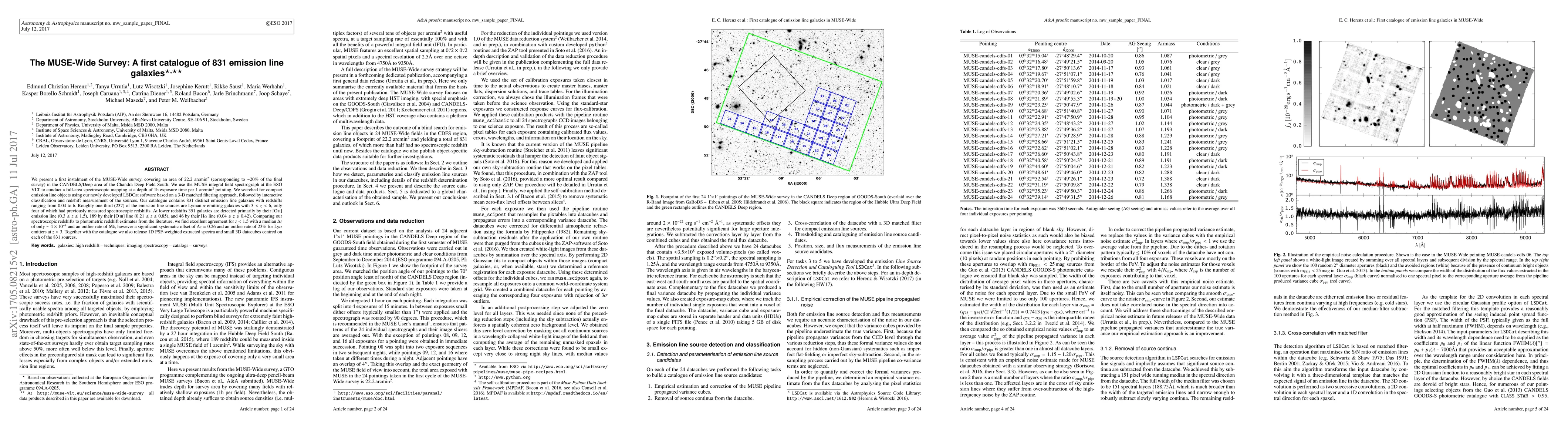 The MUSE-Wide survey presents a catalogue of 831 emission line galaxies identified in the CANDELS/Deep area using the MUSE spectrograph. The survey covers a 22.2 arcmin$^2$ area and includes galaxies with redshifts ranging from 0.04 to 6, with notable detections of Lyman $\alpha$ emitters and [OII] emitters.