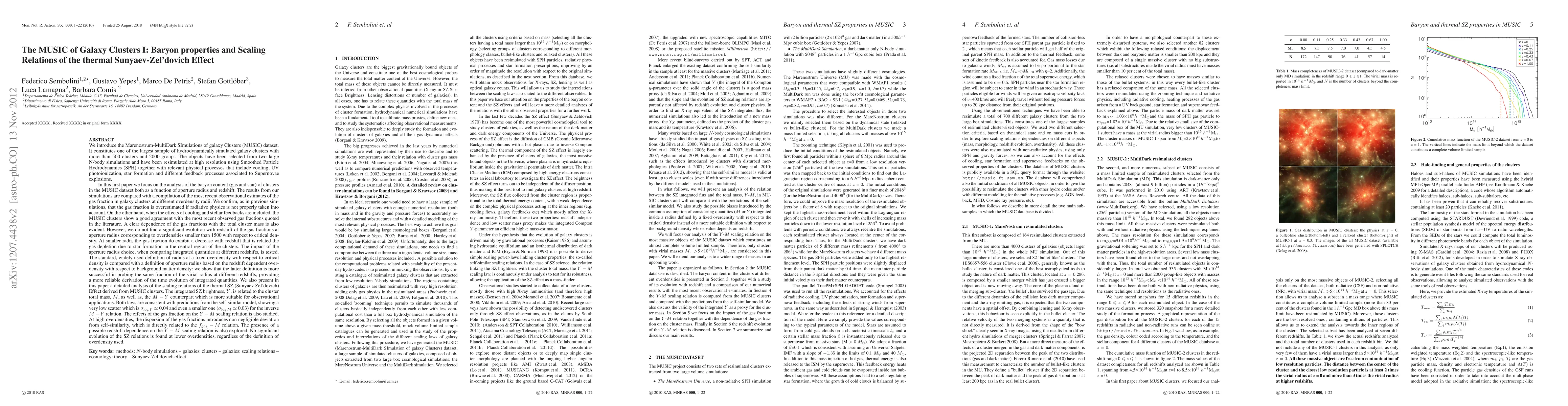 We introduce the Marenostrum-MultiDark SImulations of galaxy Clusters (MUSIC) Dataset, one of the largest sample of hydrodynamically simulated galaxy clusters with more than 500 clusters and 2000 groups. The objects have been selected from two large N-body simulations and have been resimulated at high resolution using SPH together with relevant physical processes (cooling, UV photoionization, star formation and different feedback processes). We focus on the analysis of the baryon content (gas and star) of clusters in the MUSIC dataset both as a function of aperture radius and redshift. The results from our simulations are compared with the most recent observational estimates of the gas fraction in galaxy clusters at different overdensity radii. When the effects of cooling and stellar feedbacks are included, the MUSIC clusters show a good agreement with the most recent observed gas fractions quoted in the literature. A clear dependence of the gas fractions with the total cluster mass is also evident. The impact of the aperture radius choice, when comparing integrated quantities at different redshifts, is tested: the standard definition of radius at a fixed overdensity with respect to critical density is compared with a definition based on the redshift dependent overdensity with respect to background density. We also present a detailed analysis of the scaling relations of the thermal SZ (Sunyaev Zel'dovich) Effect derived from MUSIC clusters. The integrated SZ brightness, Y, is related to the cluster total mass, M, as well as, the M-Y counterpart, more suitable for observational applications. Both laws are consistent with predictions from the self-similar model, showing a very low scatter. The effects of the gas fraction on the Y-M scaling and the presence of a possible redshift dependence on the Y-M scaling relation are also explored.