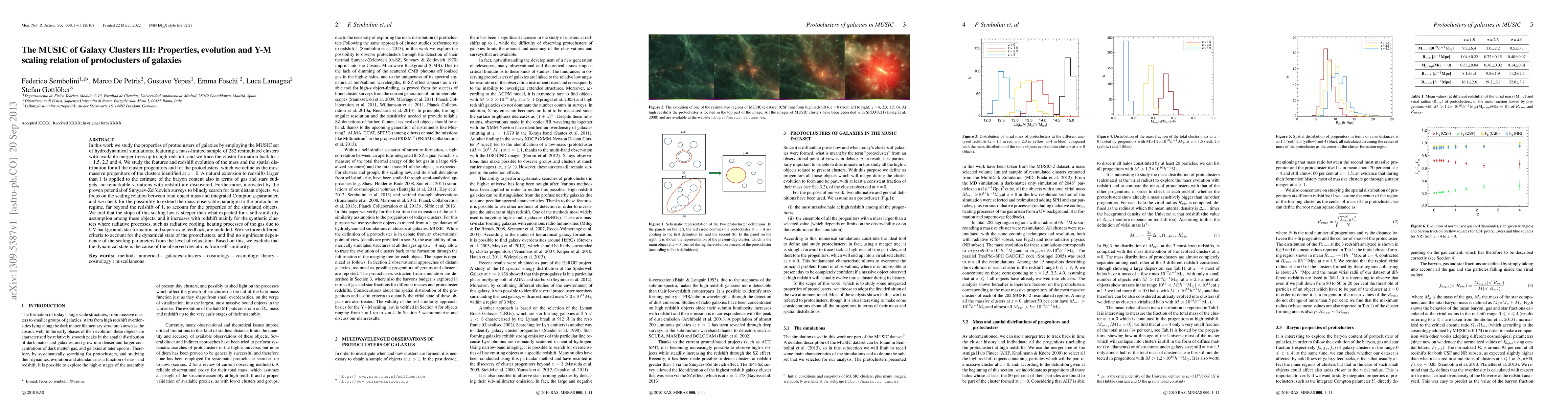 In this work we study the properties of protoclusters of galaxies by employing the MUSIC set of hydrodynamical simulations, featuring a mass-limited sample of 282 resimulated clusters with available merger trees up to high redshift, and we trace the cluster formation back to $z$ = 1.5, 2.3 and 4. We study the features and redshift evolution of the mass and the spatial distribution for all the cluster progenitors and for the protoclusters, which we define as the most massive progenitors of the clusters identified at $z$ = 0. A natural extension to redshifts larger than 1 is applied to the estimate of the baryon content also in terms of gas and stars budgets: no remarkable variations with redshift are discovered. Furthermore, motivated by the proven potential of Sunyaev-Zel'dovich surveys to blindly search for faint distant objects, we focus on the scaling relation between total object mass and integrated Compton $y$-parameter, and we check for the possibility to extend the mass-observable paradigm to the protocluster regime, far beyond the redshift of 1, to account for the properties of the simulated objects. We find that the slope of this scaling law is steeper than what expected for a self-similarity assumption among these objects, and it increases with redshift mainly for the synthetic clusters where radiative processes, such as radiative cooling, heating processes of the gas due to UV background, star formation and supernovae feedback, are included. We use three different criteria to account for the dynamical state of the protoclusters, and find no significant dependence of the scaling parameters from the level of relaxation. Based on this, we exclude that the dynamical state is the cause of the observed deviations from self-similarity.