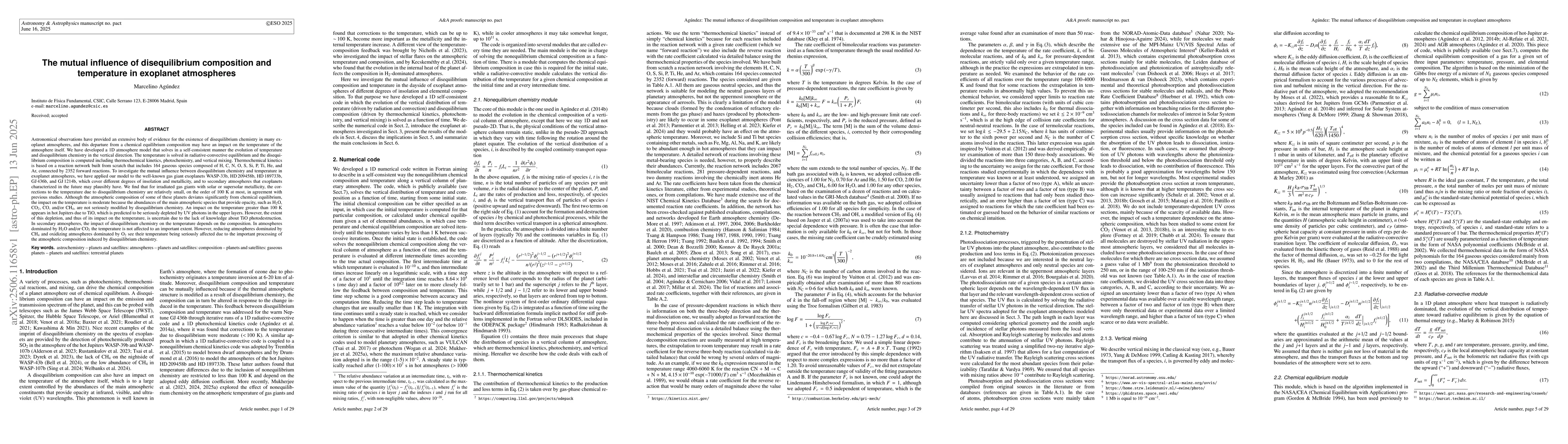 This research introduces a 1D planetary atmosphere model that simulates temperature and disequilibrium chemistry evolution in exoplanet atmospheres, using a comprehensive reaction network. The study finds that temperature corrections in irradiated gas giants due to disequilibrium chemistry are minor, except for hot Jupiters where TiO depletion can impact temperature significantly, but with uncertainties. Secondary atmospheres' temperature is affected by disequilibrium chemistry depending on their composition, with H2O/CO2-dominated atmospheres remaining largely unaffected while CH4 and O2-dominated atmospheres experience substantial temperature changes.