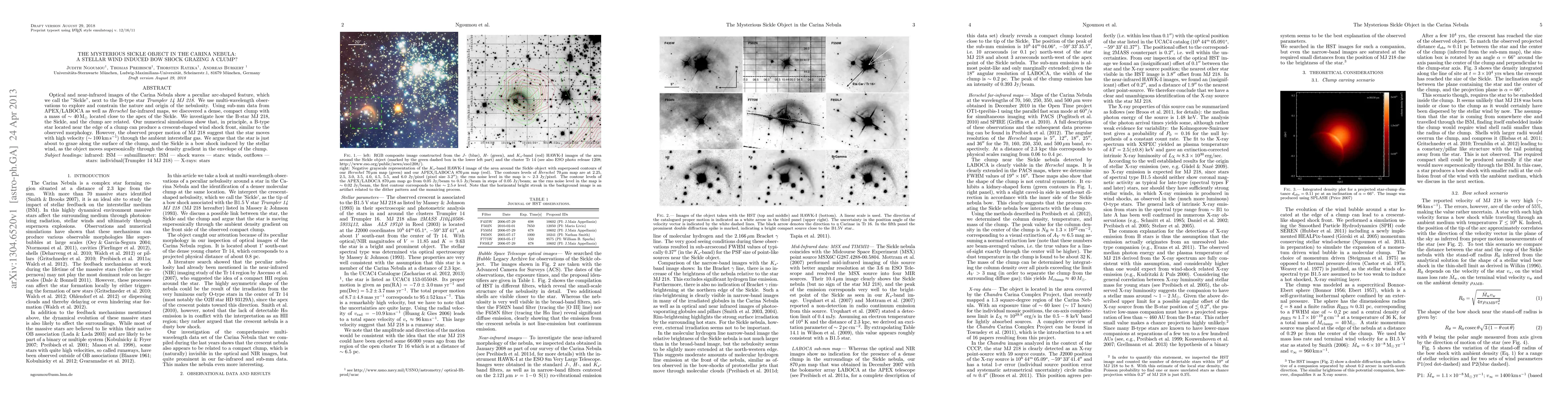 The Carina Nebula's "Sickle" arc-shaped feature, adjacent to the B-type star Trumpler 14 MJ 218, is identified as a bow shock induced by the star's stellar wind grazing a nearby dense, compact clump. Numerical simulations support this interpretation, considering the star's high-velocity motion through the interstellar medium.